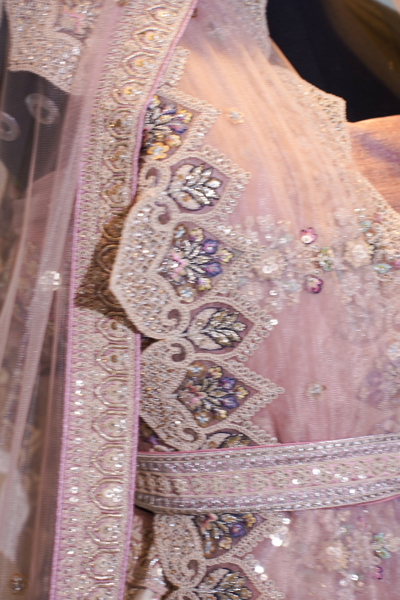 The intricate motifs—depicting royal patterns, floral vines, and delicate heritage art—are meticulously embroidered using zari, resham, and sequence work, bringing life to every inch of the fabric. The lehenga’s soft blush-pink shade adds a dreamy touch, making it perfect for brides, engagements, receptions, or grand celebrations.