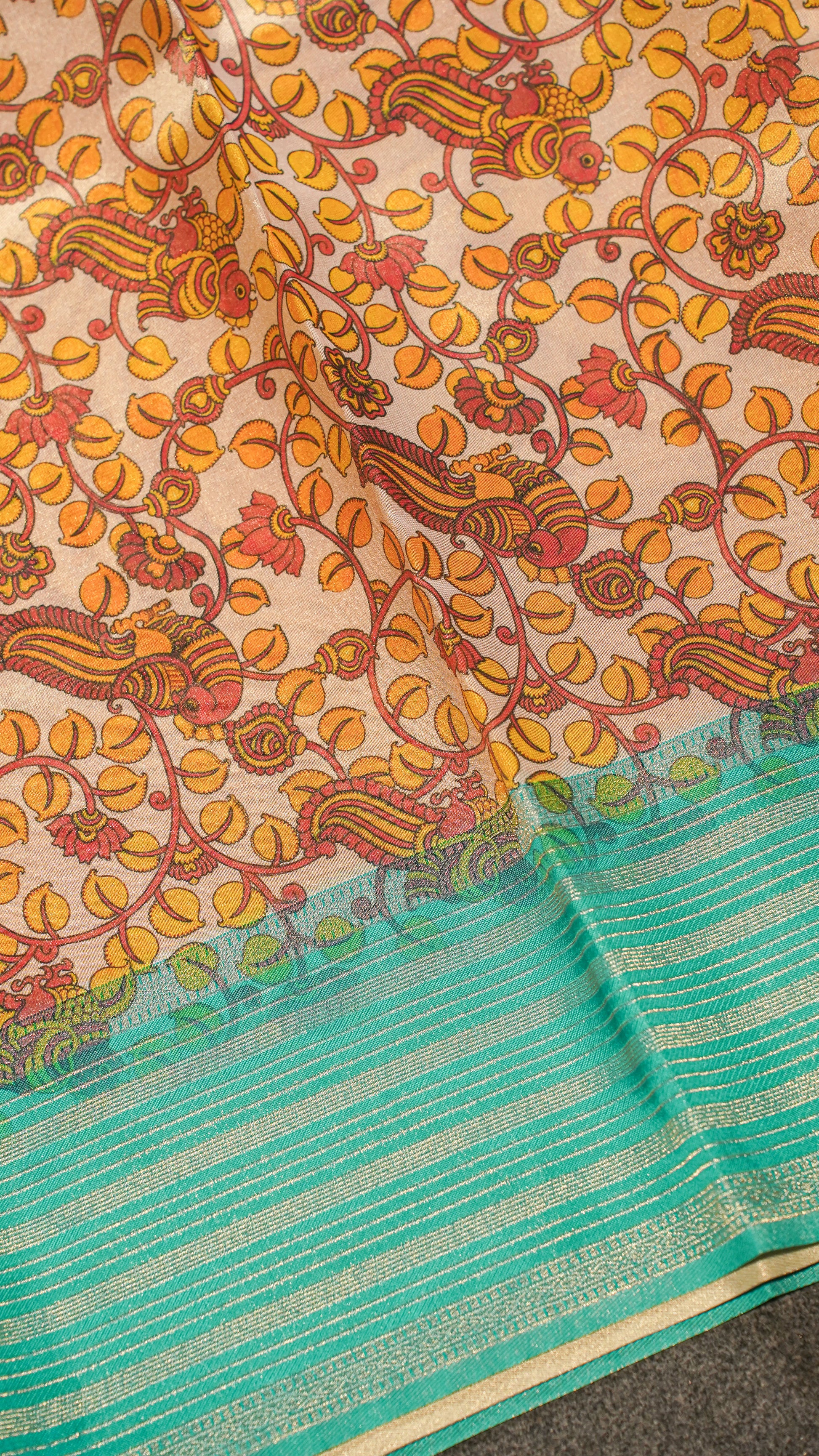 Celebrate the artistry of tradition with our exquisite Banarasi Tissue Kalamkari Silk Saree, a timeless piece that brings together the brilliance of Banarasi weaving and the soulful beauty of Kalamkari art. This saree features intricately handwoven mythical motifs, florals, and vines, set against a shimmering beige-gold tissue base, accented with vibrant red, orange, and yellow hues.