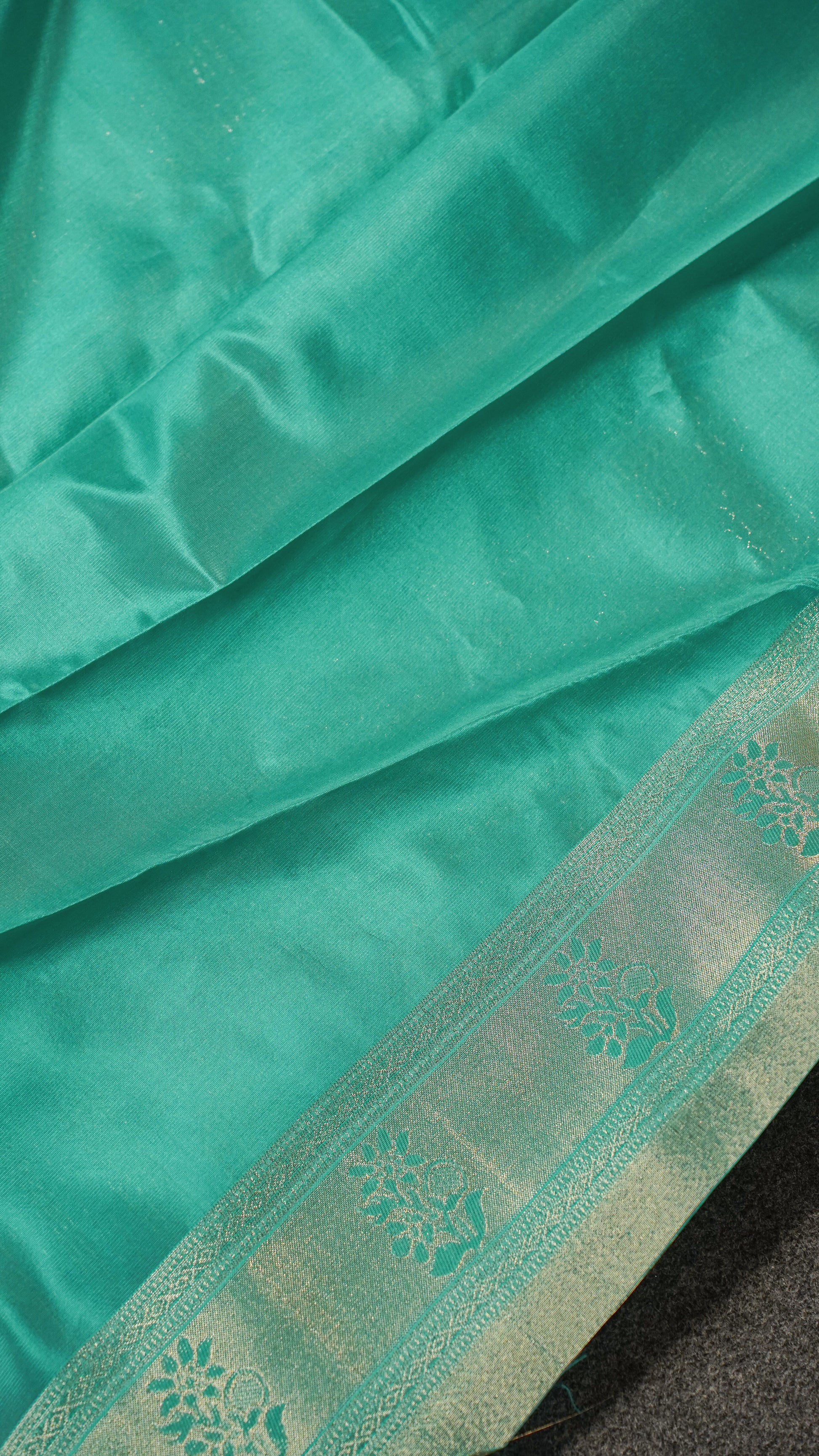 The highlight of this saree is its aqua green zari pallu and border, adding a refreshing contrast and luxurious touch. The entire drape glows with a light-reflecting sheen, making it a perfect choice for weddings, festive occasions, and art-inspired wardrobes.
