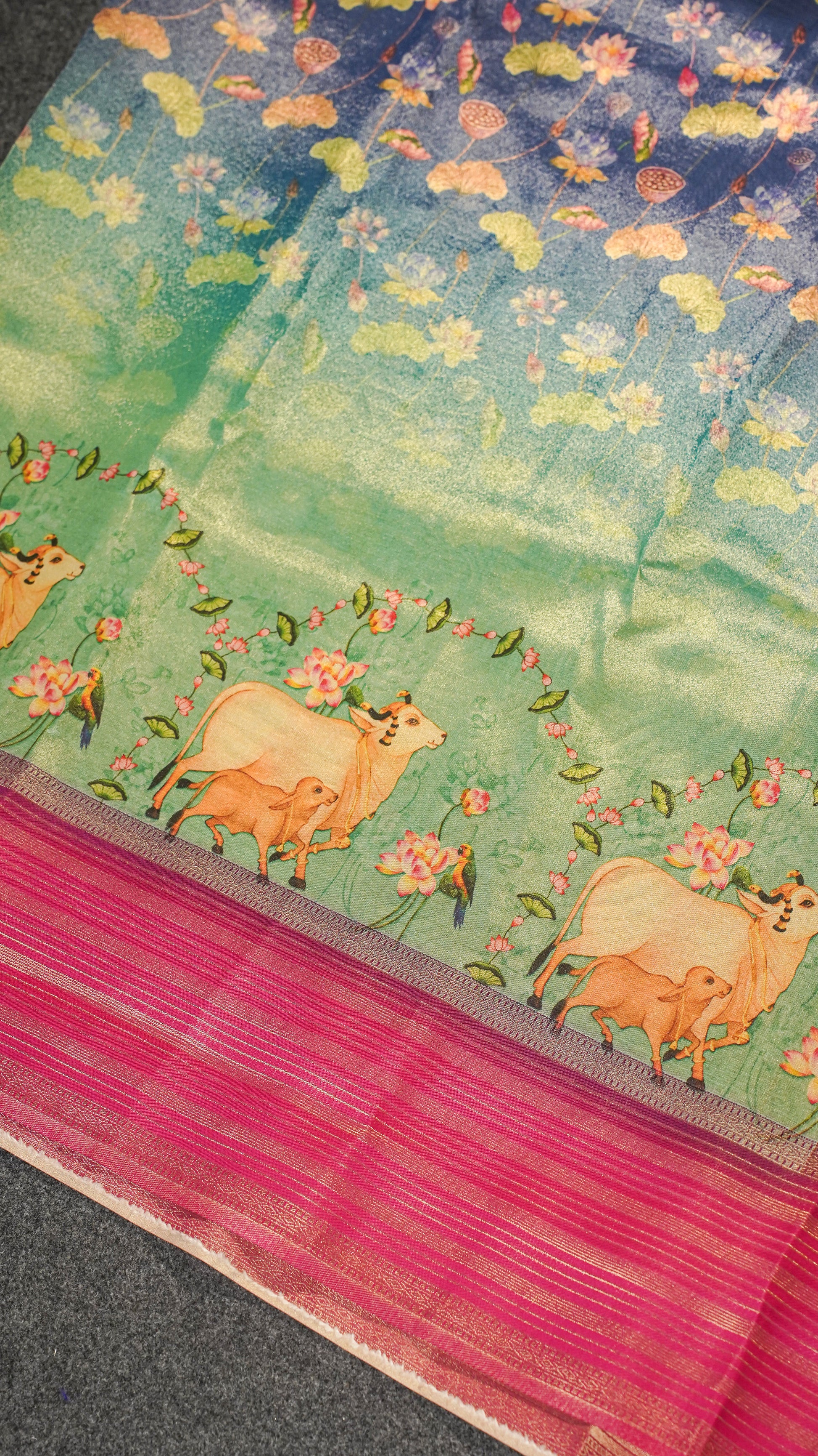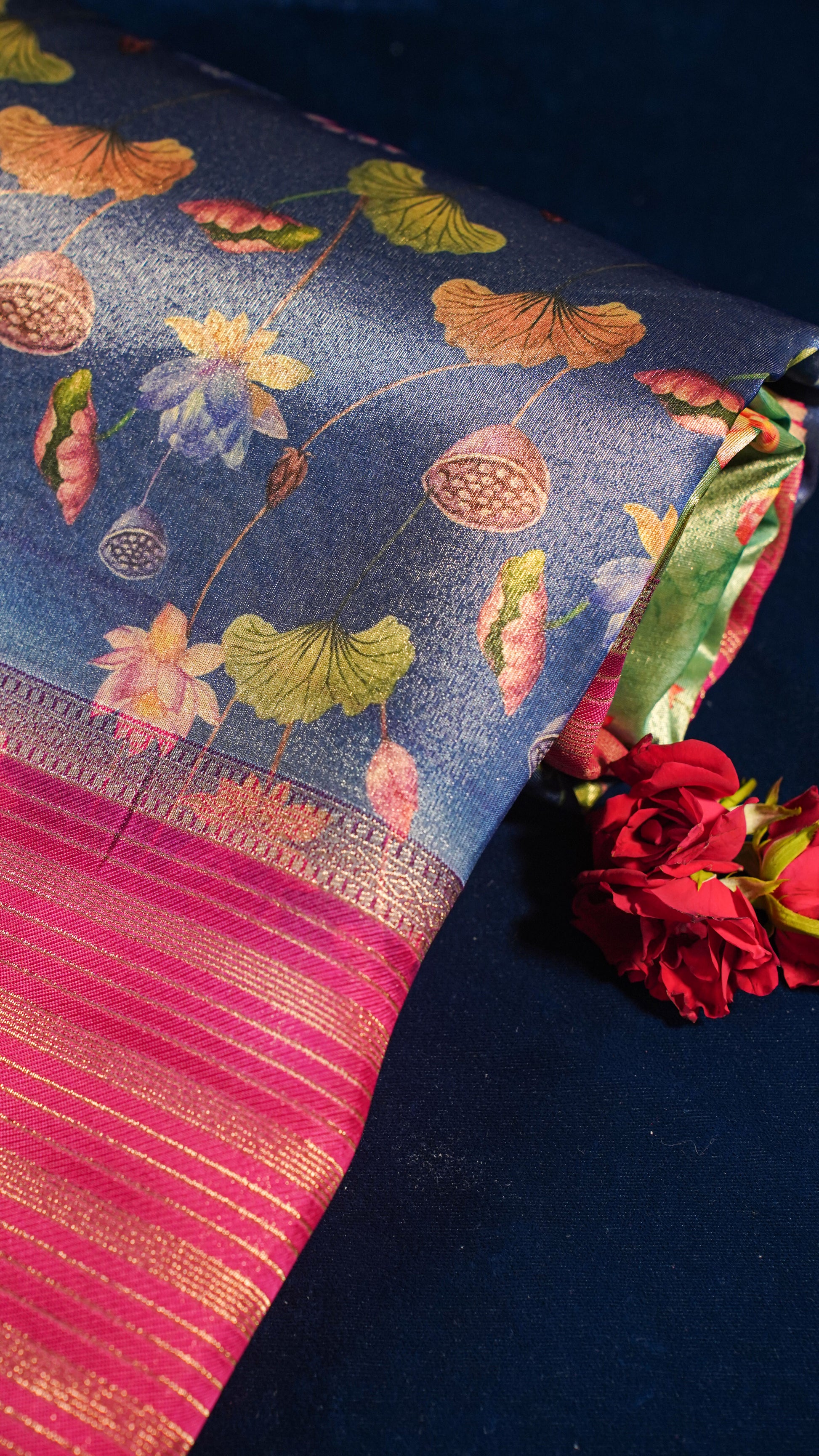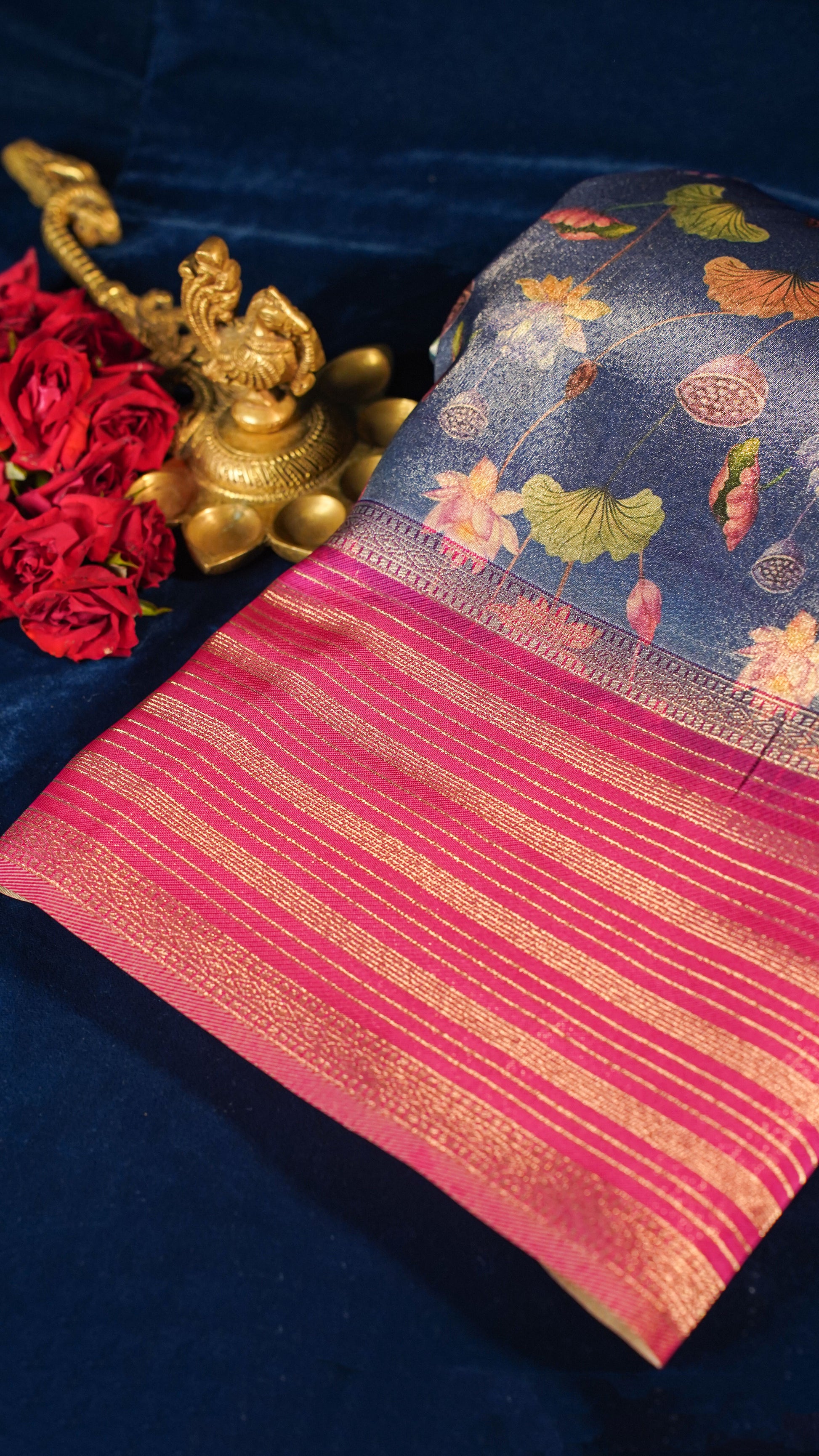 The rich royal blue base is adorned with intricate digital floral and paisley prints, bringing a modern twist to the age-old Banarasi weave. The lightweight texture of tissue silk drapes gracefully and offers unmatched comfort throughout the day.