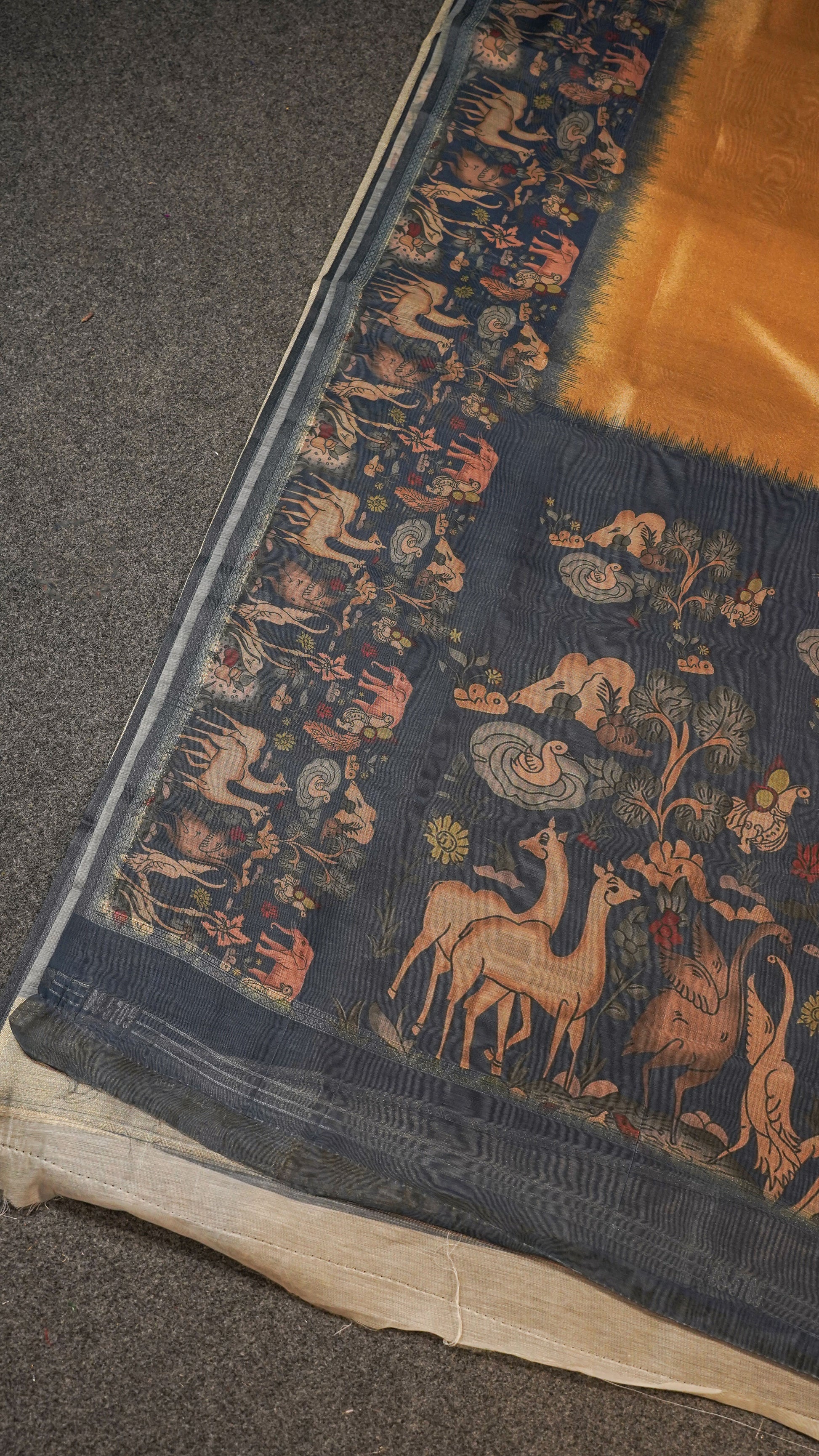 Border & Pallu: Richly illustrated with animals, florals, and nature motifs