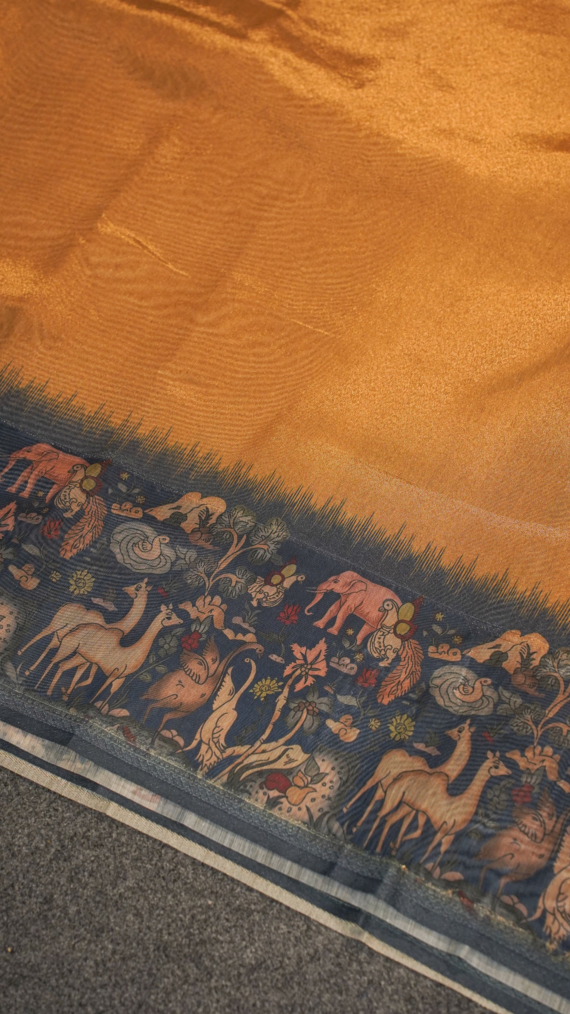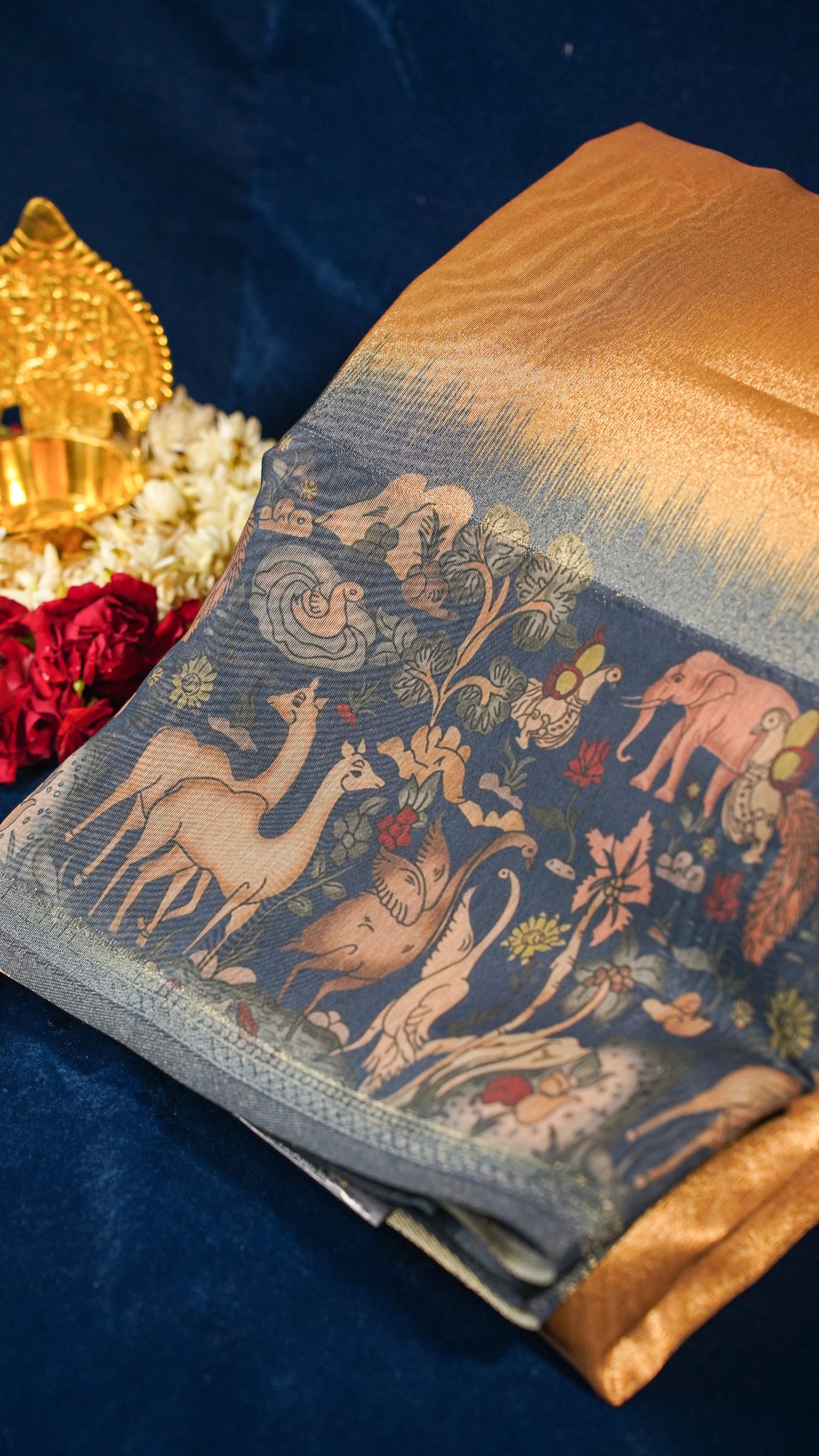 Celebrate the union of artistry and elegance with our Banarasi Tissue Cotton Silk Saree, a perfect blend of lightweight comfort and royal charm. This saree features a luminous copper-gold tissue body paired with an enchanting digitally printed border inspired by wildlife and nature — including motifs of elephants, deer, swans, florals, and birds — lending it an artistic, heritage touch.