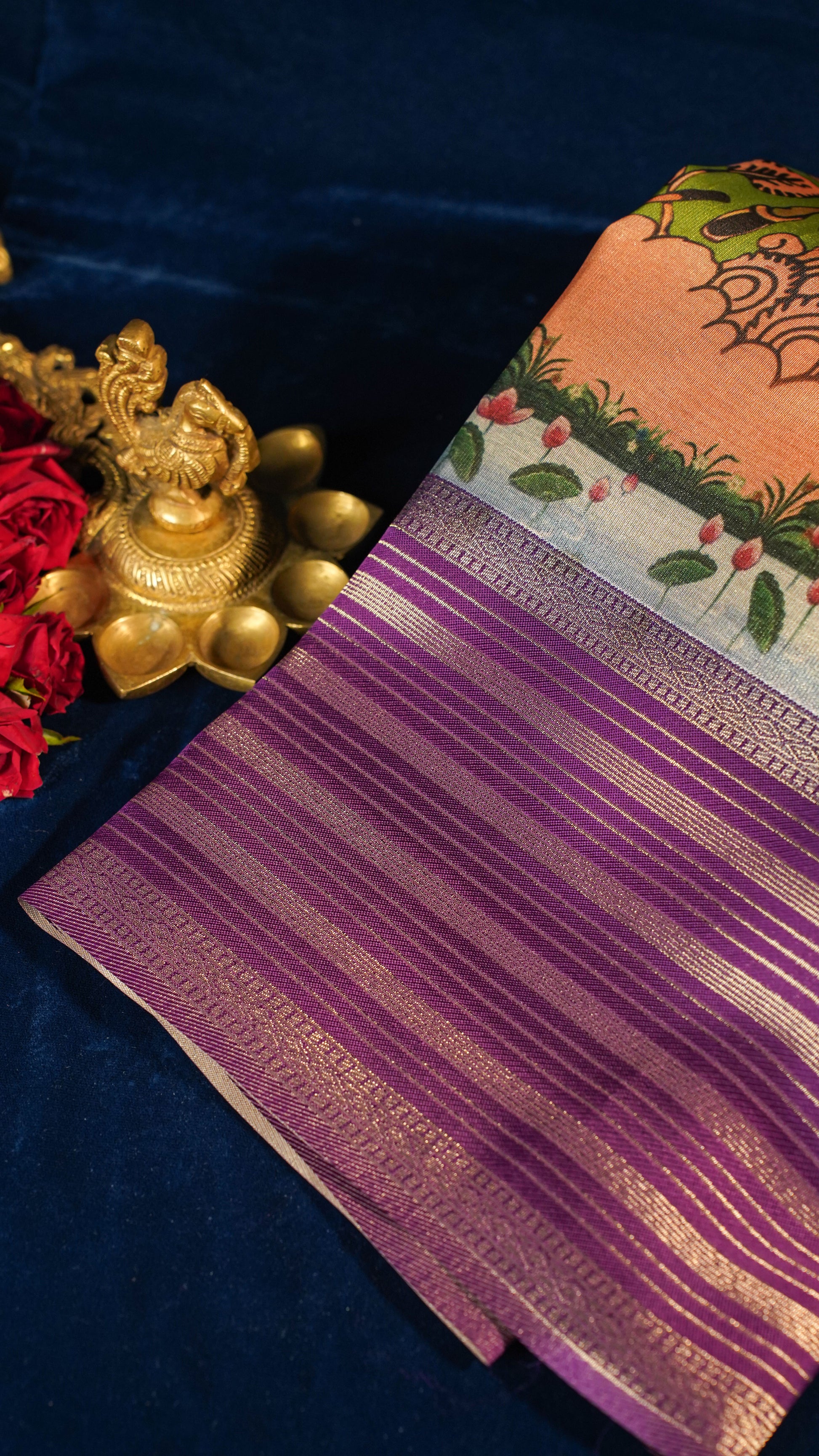 The lightweight texture of tissue silk drapes gracefully, offering both comfort and grandeur—perfect for weddings, festive occasions, or evening soirees. The subtle shimmer of the fabric paired with the detailed Banarasi weaving and refined zari borders adds a regal touch that captures every eye.