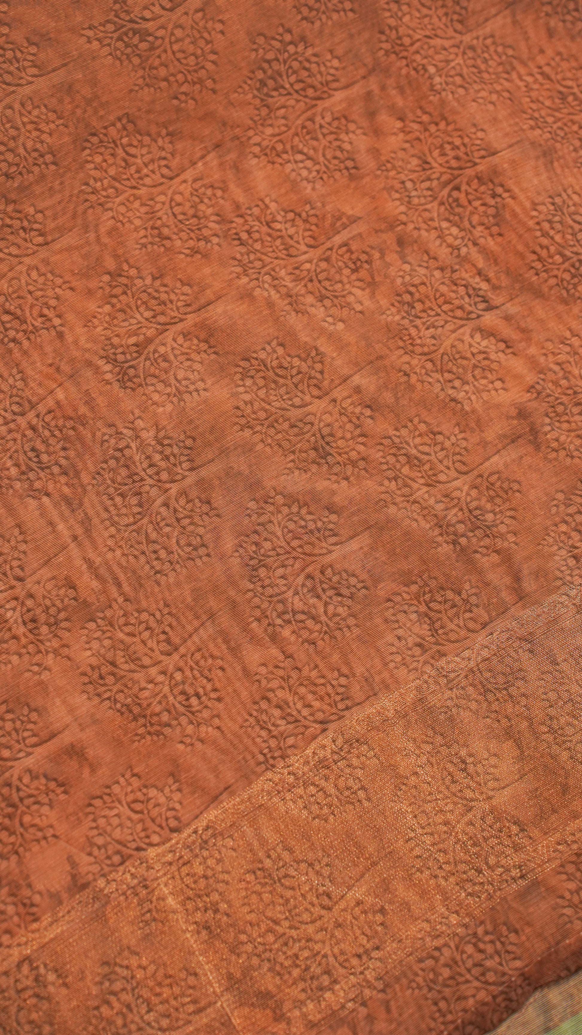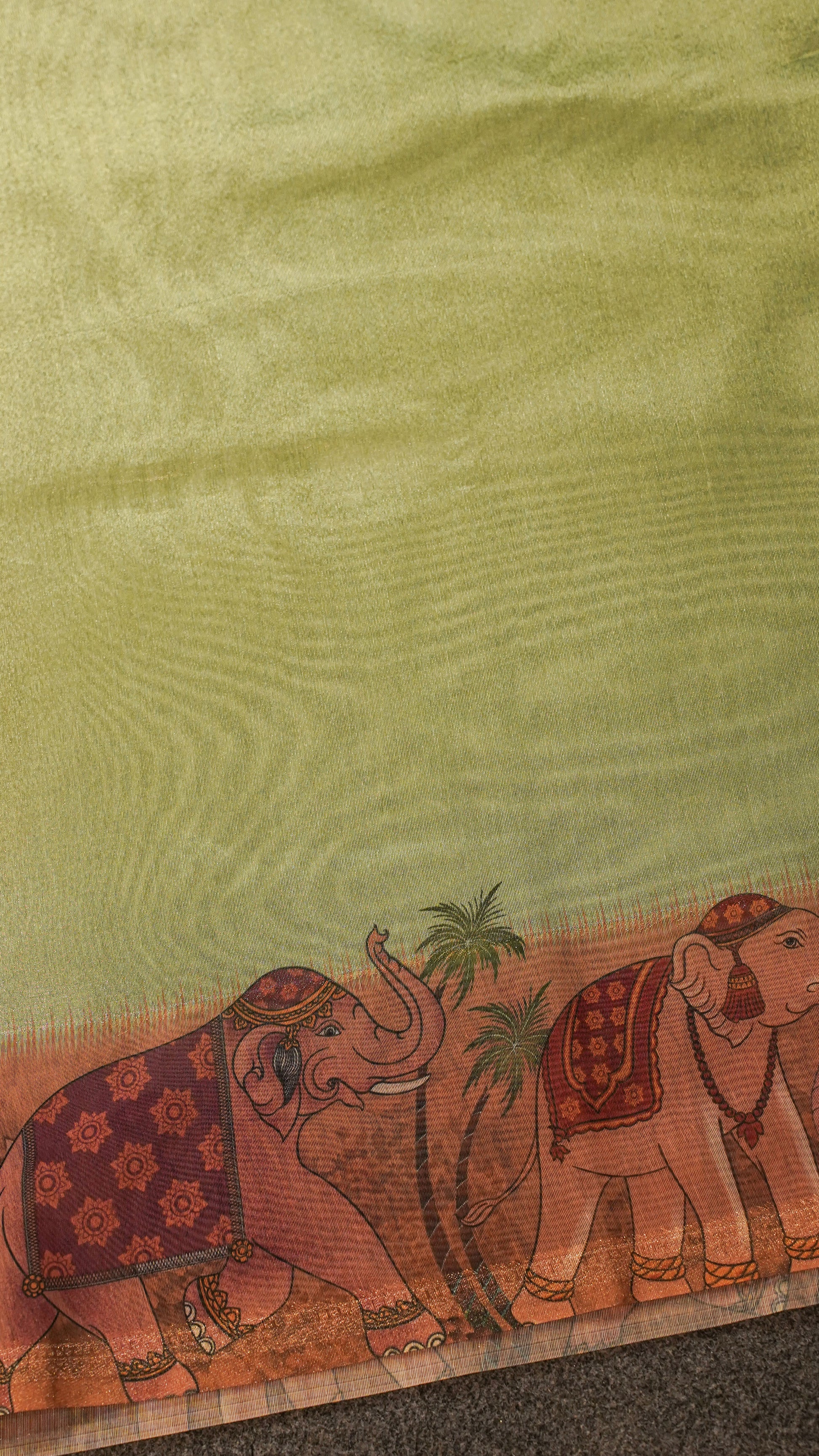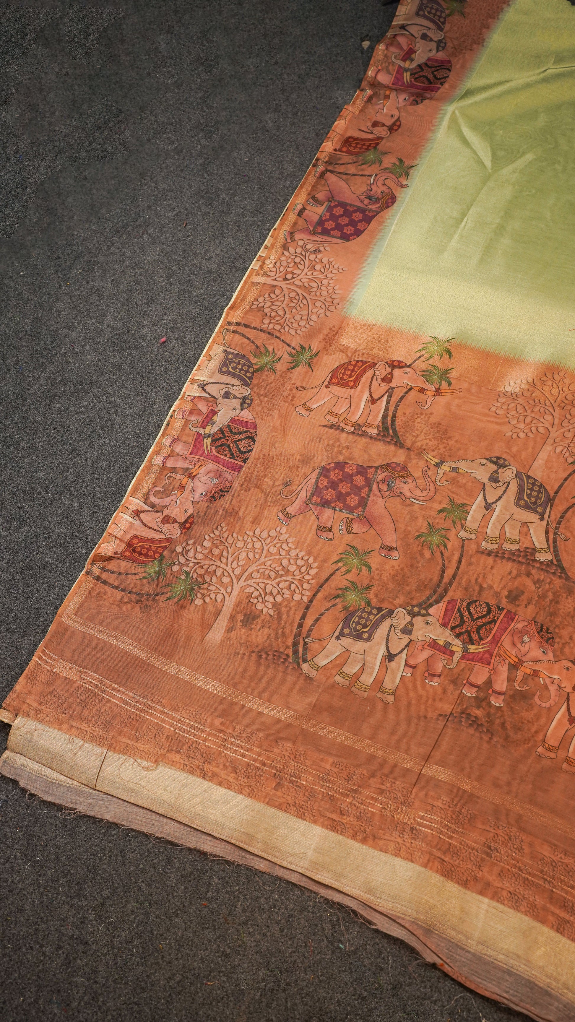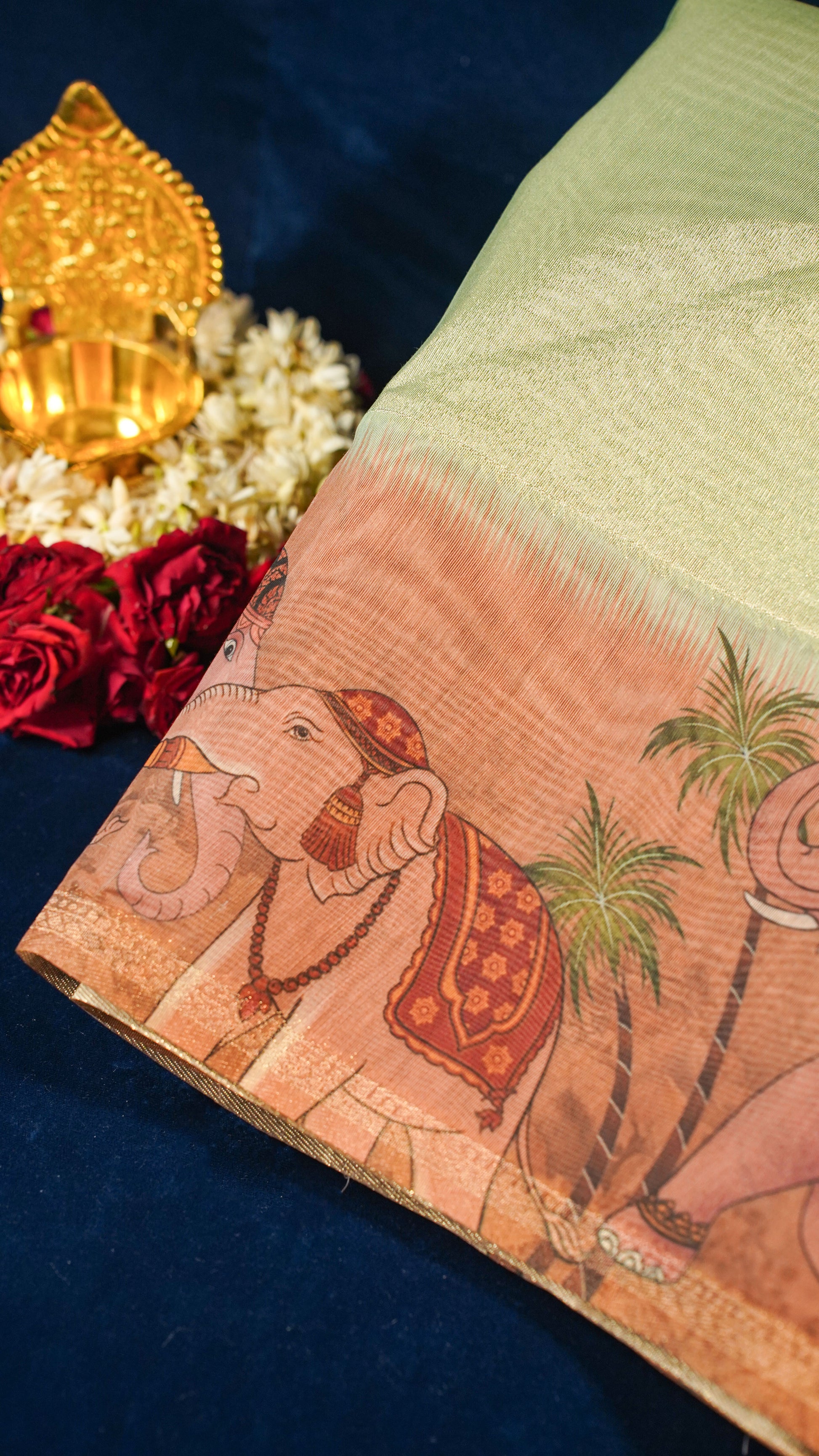 Unveil elegance with this captivating Banarasi Tissue Cotton Silk Saree, where traditional weaving meets contemporary art. Crafted in a light pistachio green tissue silk blend, this saree is adorned with a majestic digital elephant print border, showcasing royal charm and heritage elegance. The lightweight cotton-silk fabric ensures both comfort and grace, making it ideal for day events and festive celebrations.