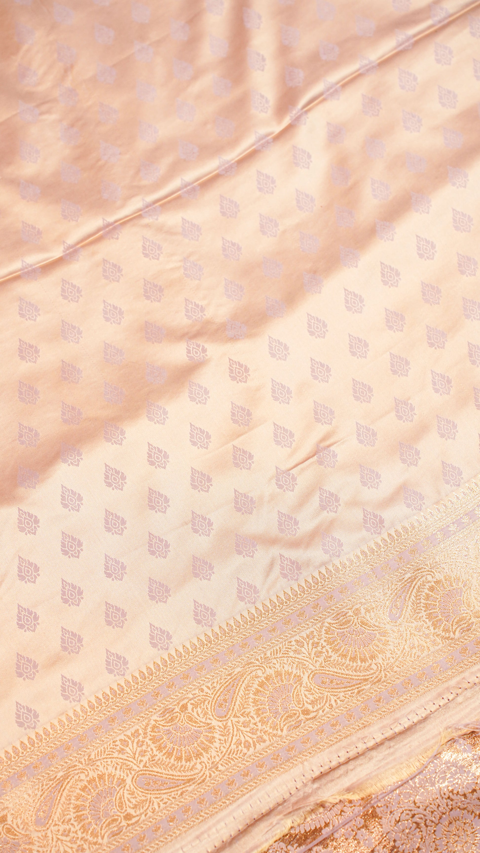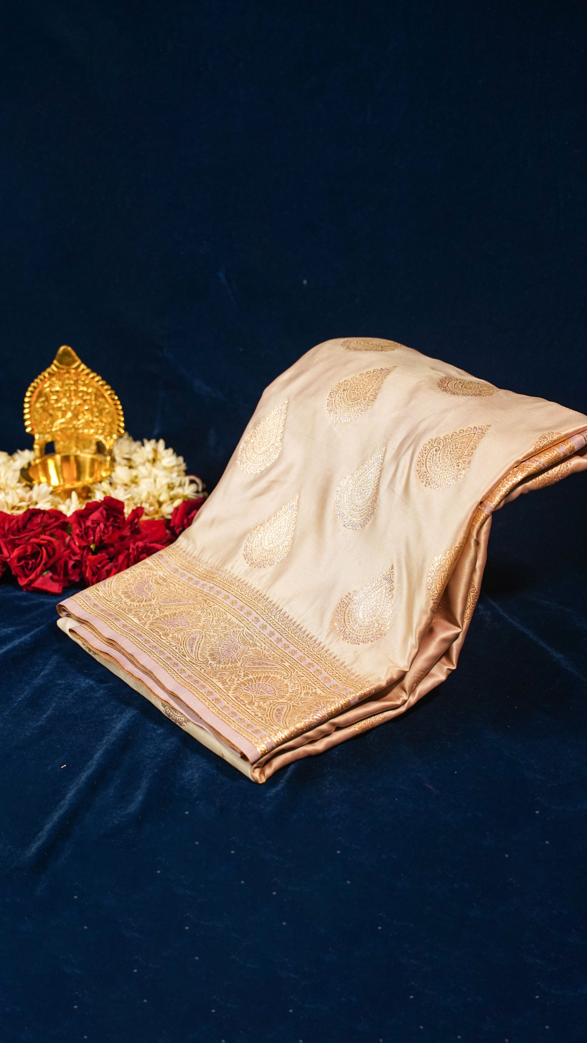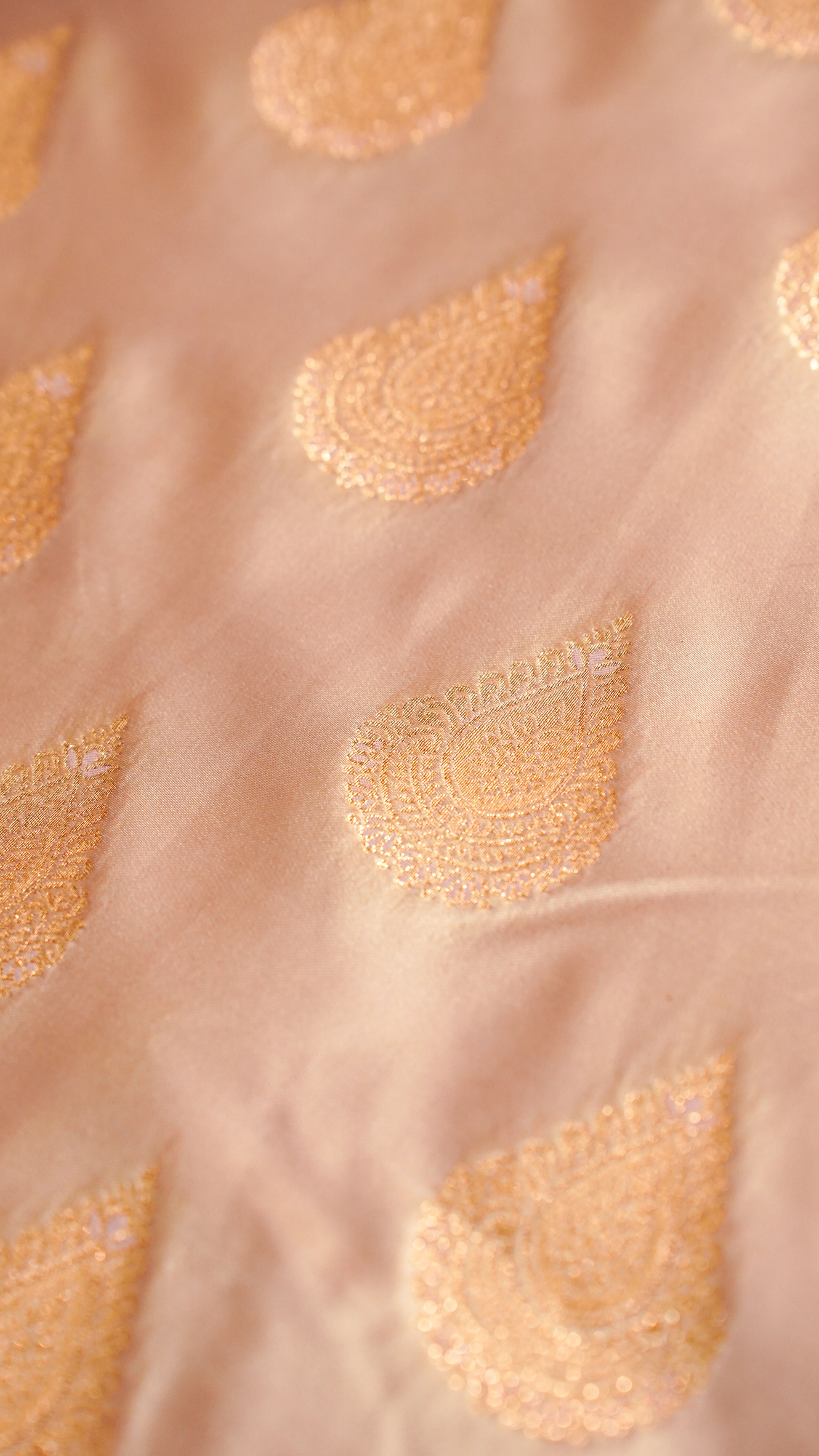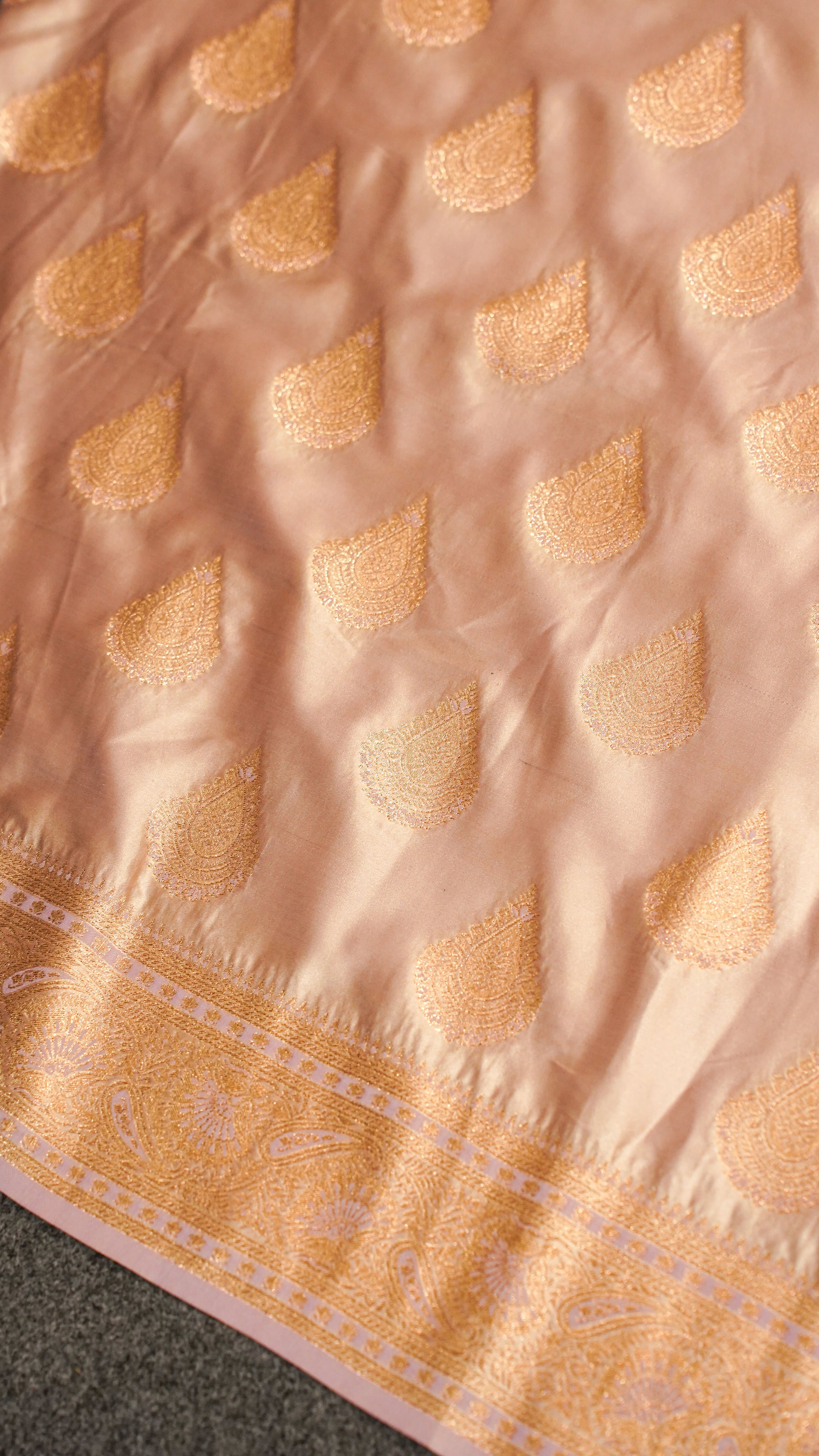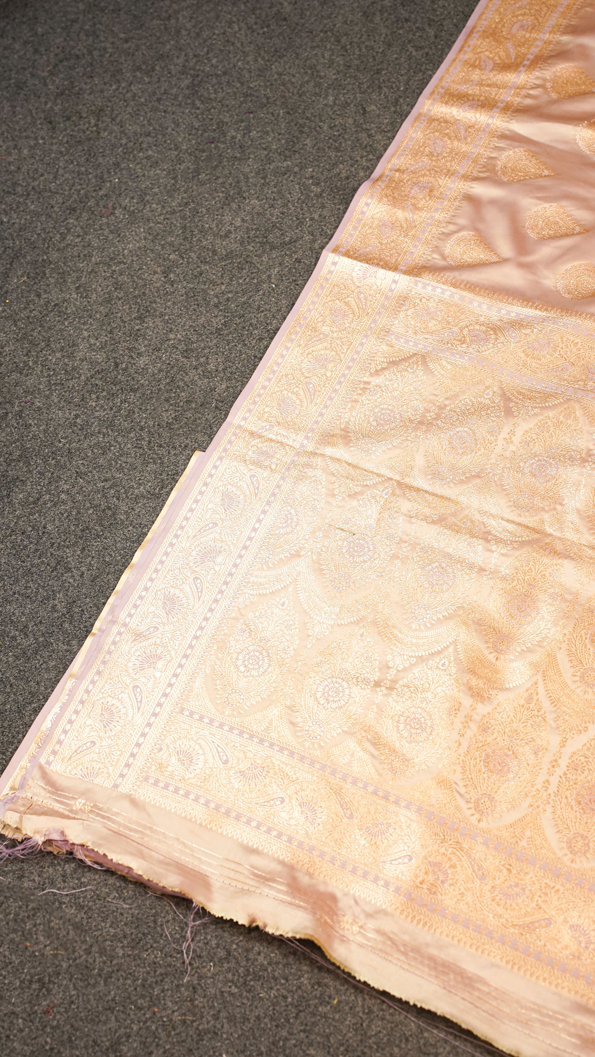 The subtle pastel pink hue adds a touch of sophistication, while the intricate Banarasi zari motifs woven in gold thread showcase timeless craftsmanship from the heart of Banaras. Lightweight yet rich in appearance, this saree is ideal for weddings, festive occasions, or graceful evening soirees.