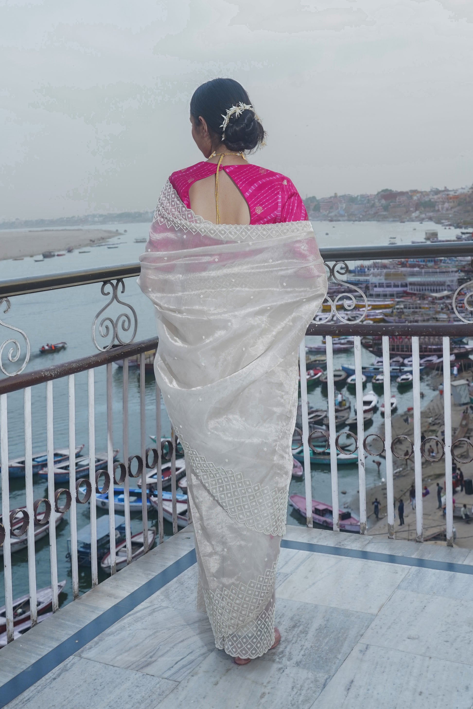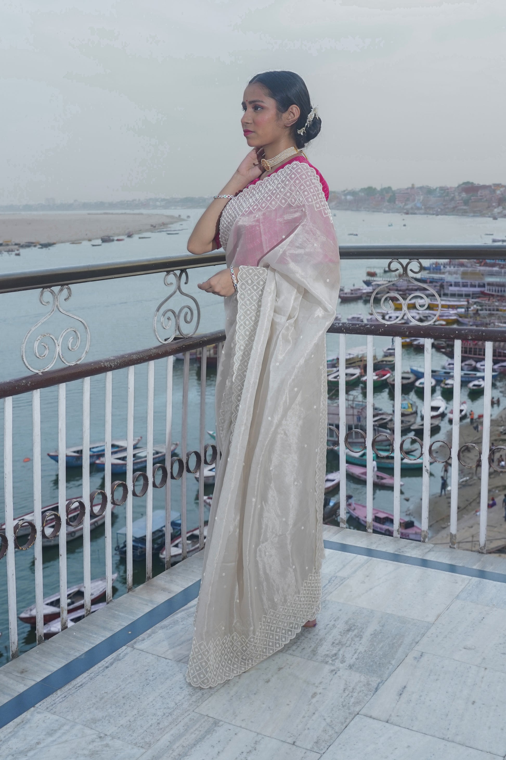 "VIRASAT 126" Off white Banarasi Tissue silk saree with pearl work