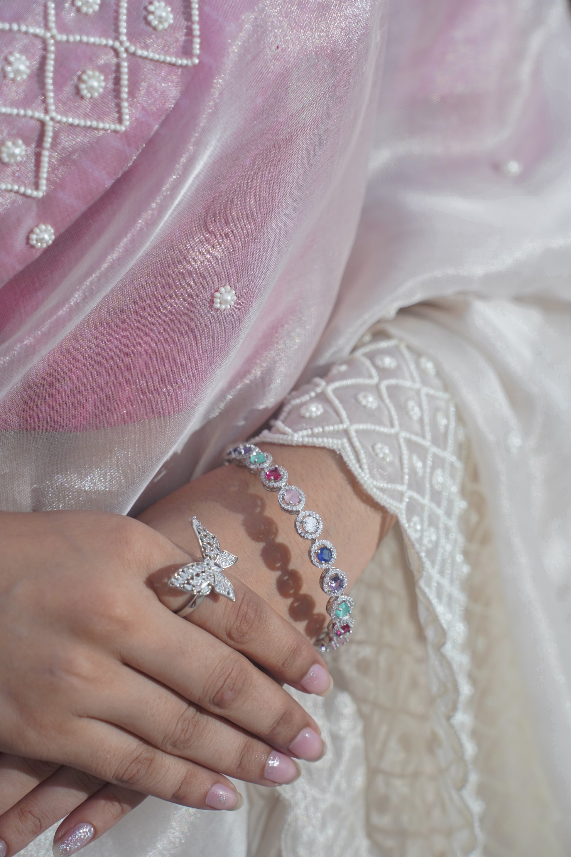 - Dry clean only to maintain the fabric’s sheen and the integrity of the pearl work.