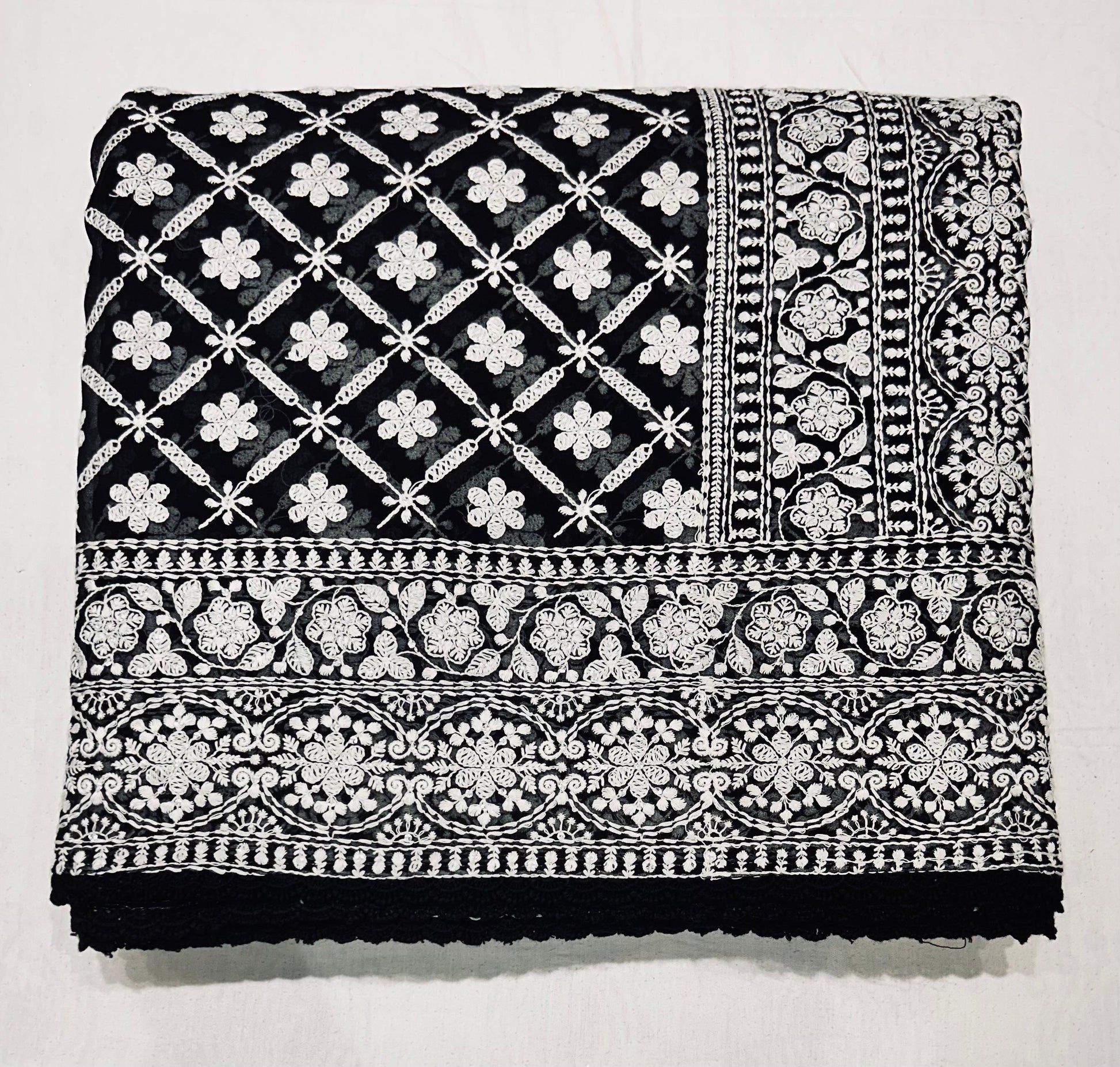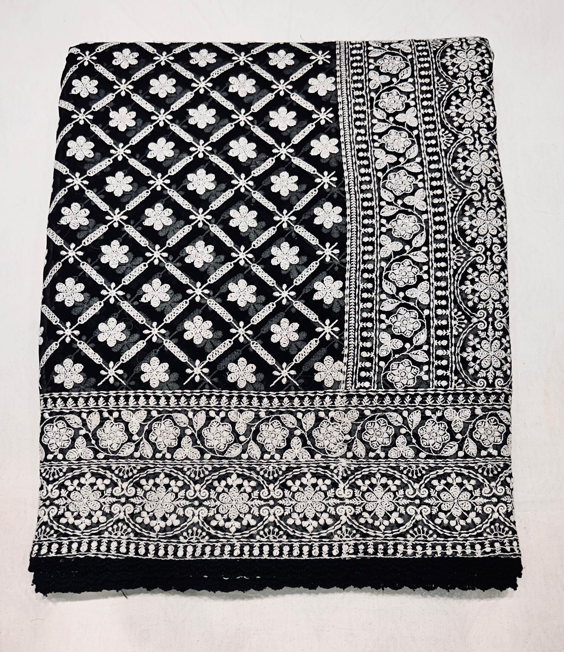 Exuding elegance and versatility, this Black Georgette Chikankari Saree is a timeless addition to your wardrobe. Crafted from super-soft fabric, it offers unmatched comfort while maintaining its luxurious appeal. The saree showcases exquisite chikankari embroidery, a testament to masterful craftsmanship and attention to detail, making it a perfect blend of tradition and contemporary style.