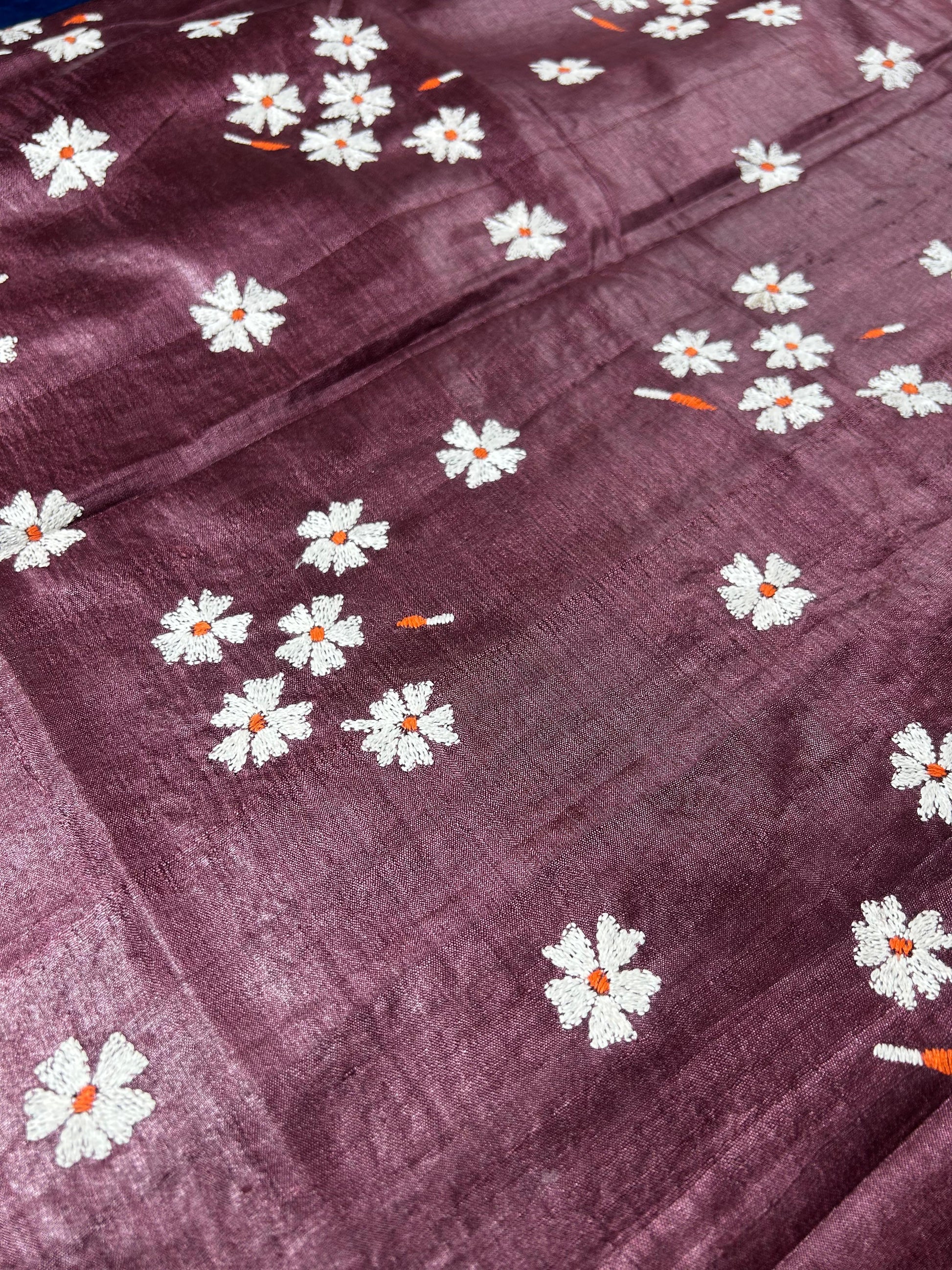 "Mukh- Nirmalika" Brown Pure Silk Hand Kantha Work Saree
