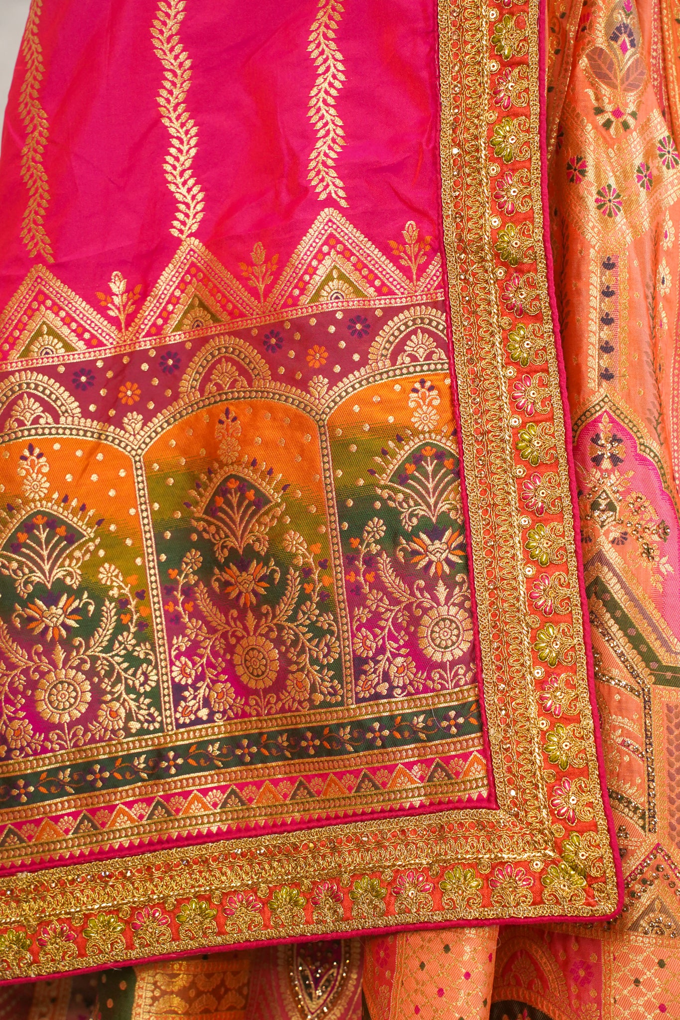 Step into timeless elegance with this Banarasi Traditional Silk Lehenga, crafted to perfection for those who love authentic Indian heritage fashion. Made from luxurious Banarasi silk, this lehenga features a vibrant blend of orange and pink tones, highlighted with fine zari weaving and intricate cutwork borders.