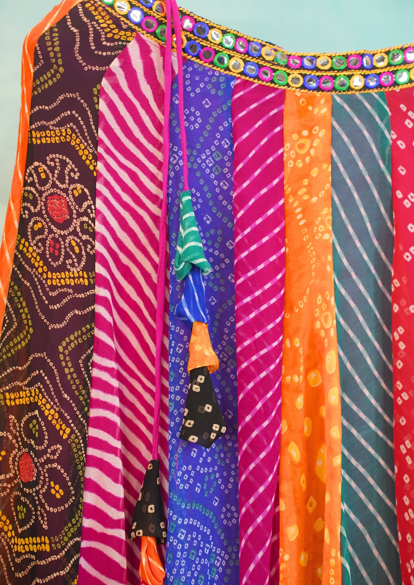 - Design: Traditional Bandhani print with mirror and pearl detailing