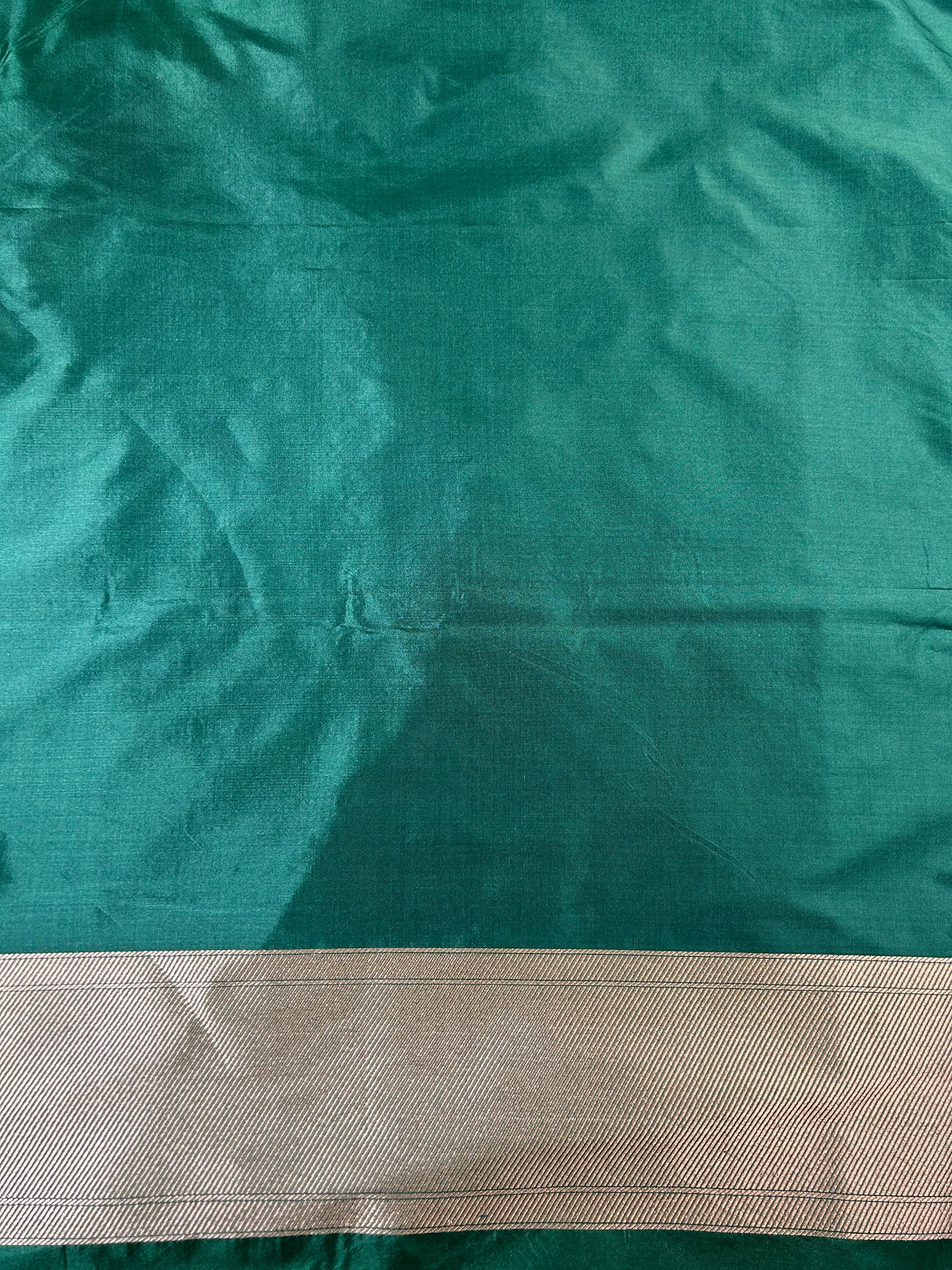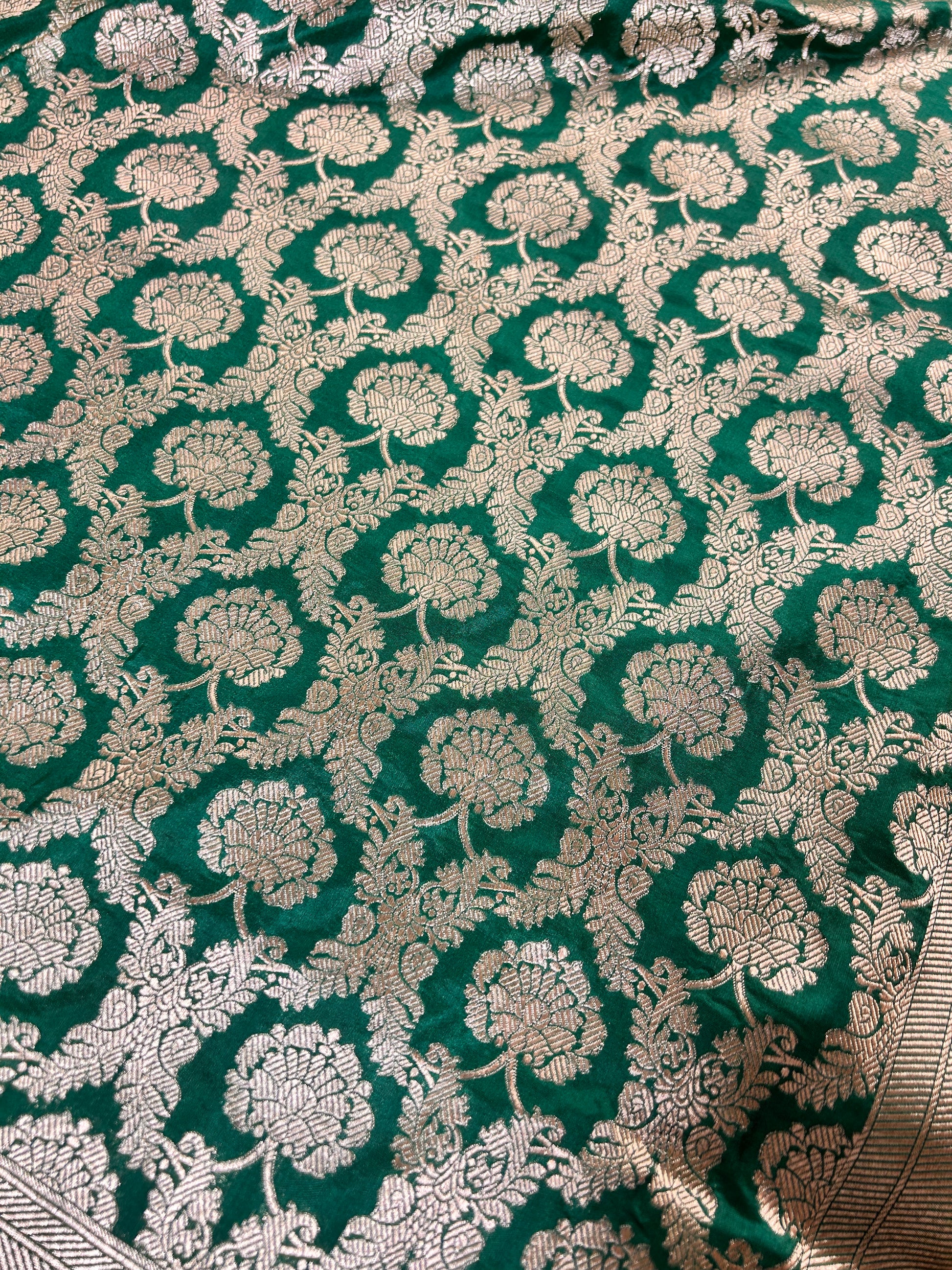 Woven by master artisans of Varanasi, this saree features a rich emerald green base adorned with intricate golden zari jaal work, capturing the essence of regal Indian aesthetics. The all-over jaal design reflects timeless elegance and showcases the finesse of age-old Banarasi weaving traditions.