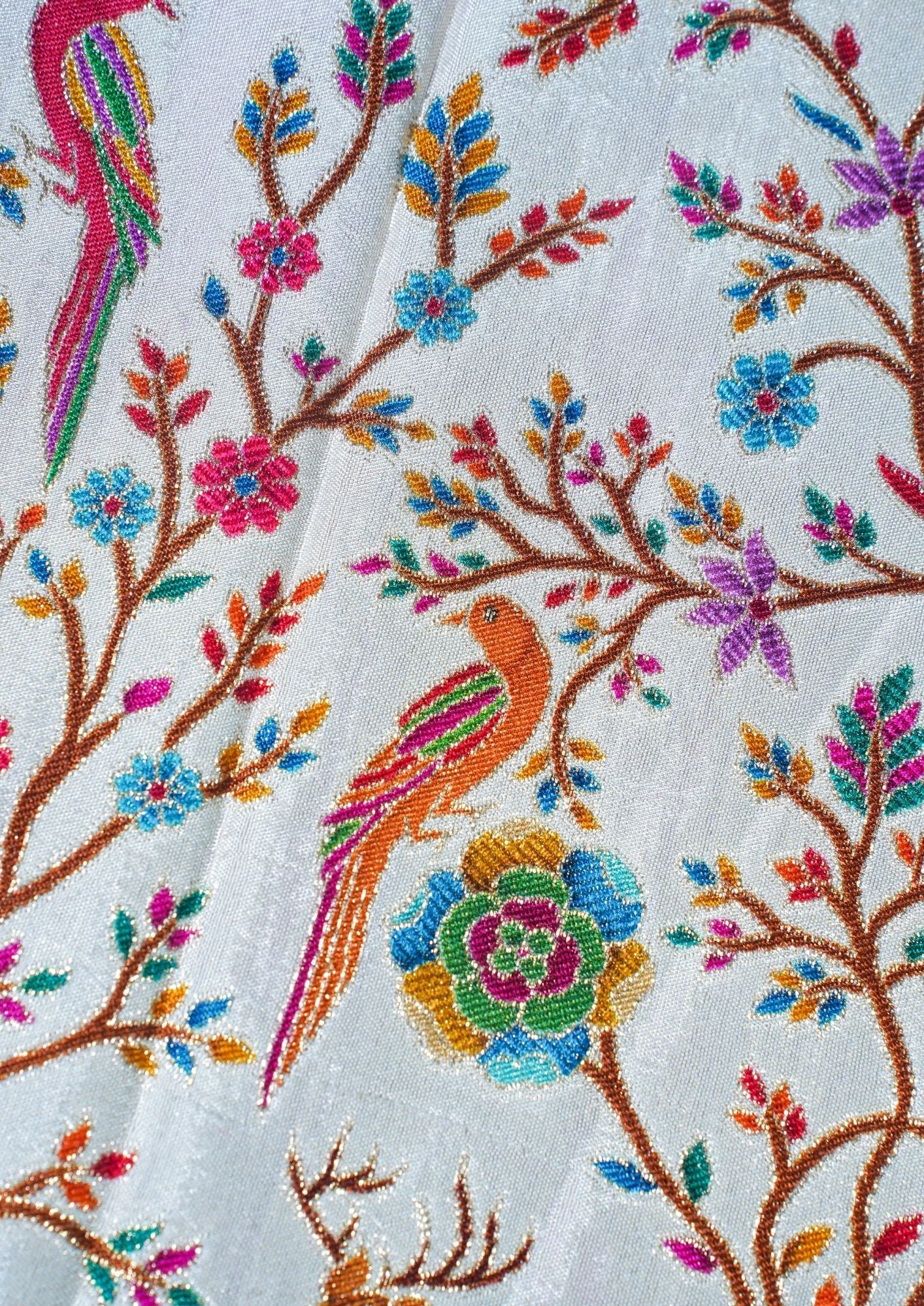 Work: Multicolor silk thread embroidery with wildlife and floral motifs