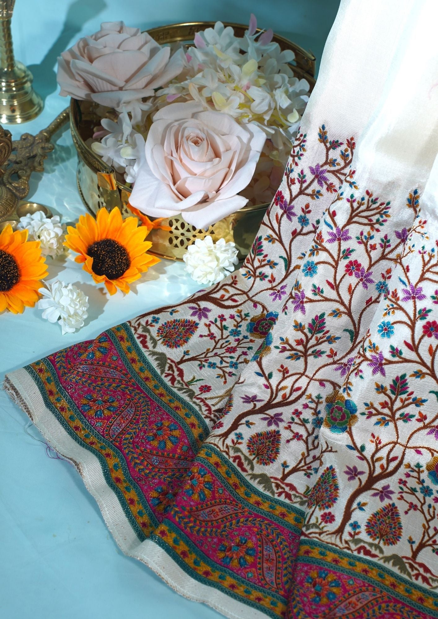 This saree features intricate hand-embroidered floral and wildlife motifs, including colorful birds and majestic deer, delicately spread across a soft ivory base. The vibrant use of pinks, purples, turquoise, gold, and green threads adds a royal touch, making it an ideal ensemble for weddings, festivals, and grand celebrations.