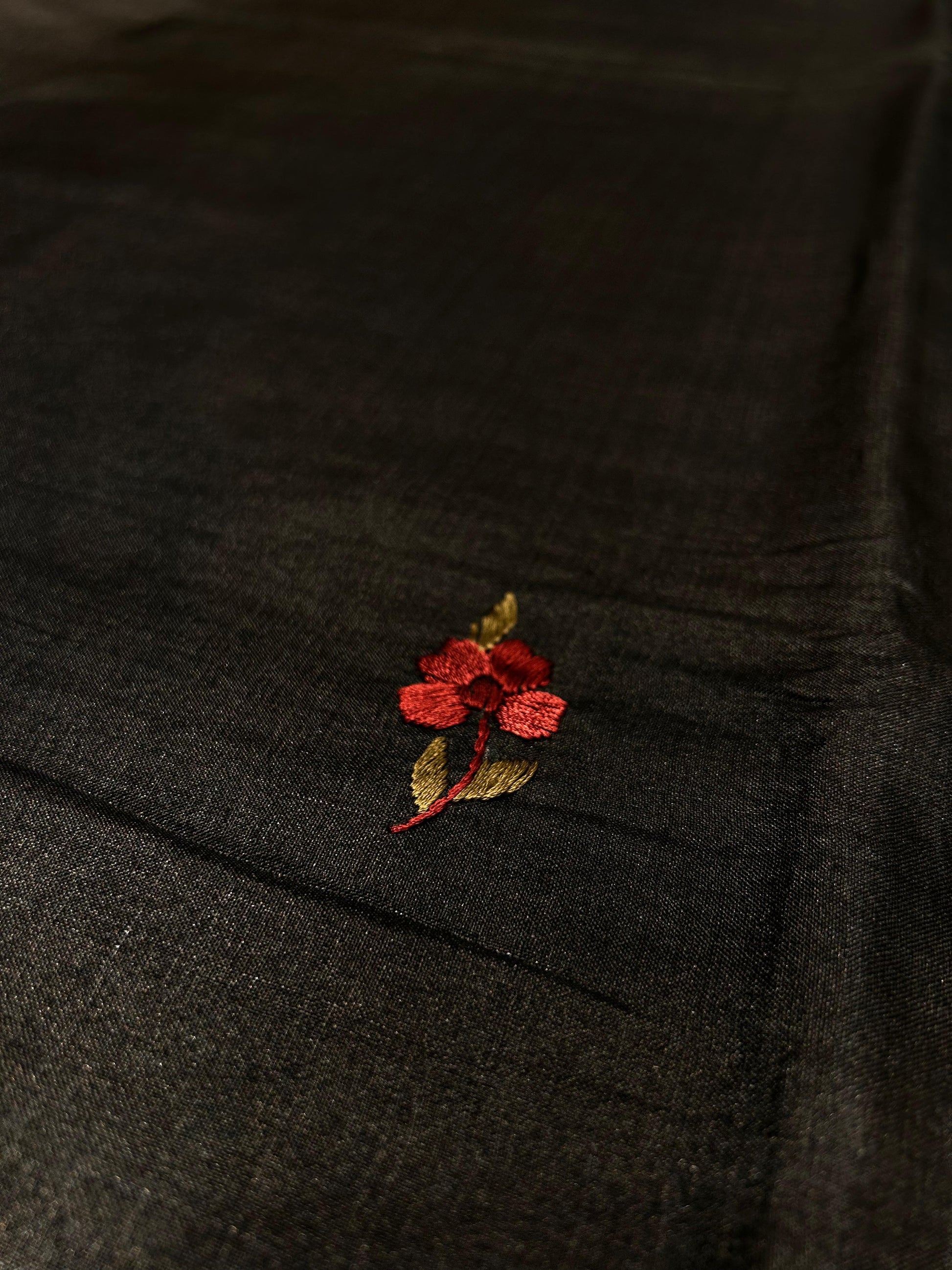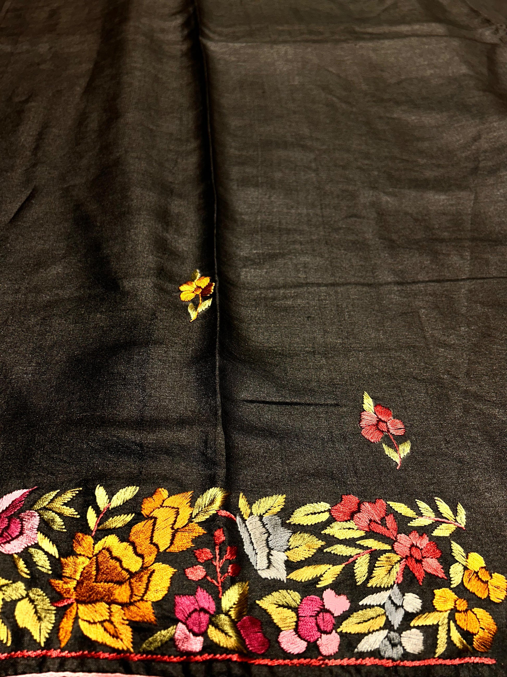 Experience unparalleled elegance with this Pure Silk Hand Parsi Work Tussar Silk Saree. Adorned with delicate Parsi embroidery, it showcases intricate floral and vine motifs, reflecting timeless artistry.
