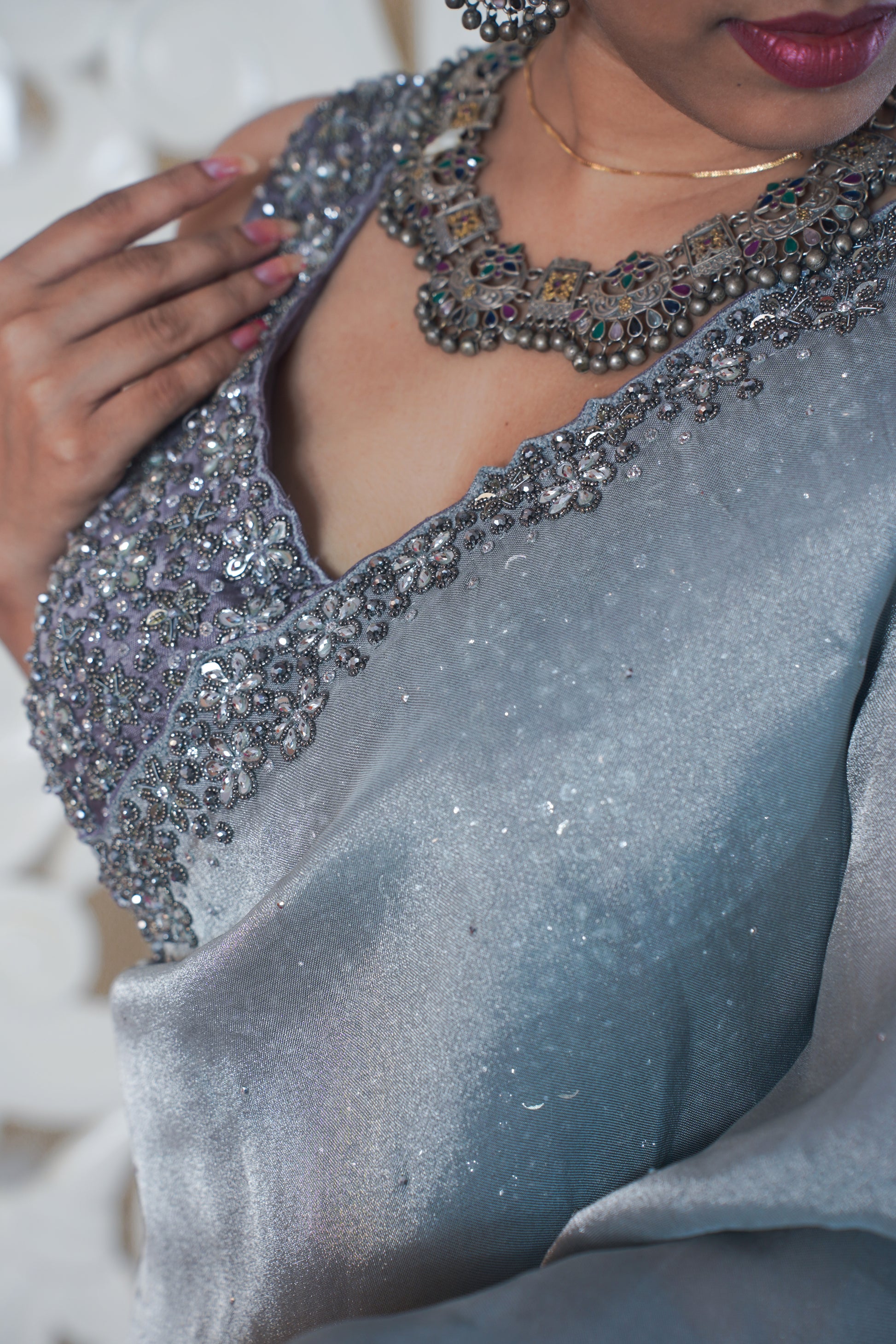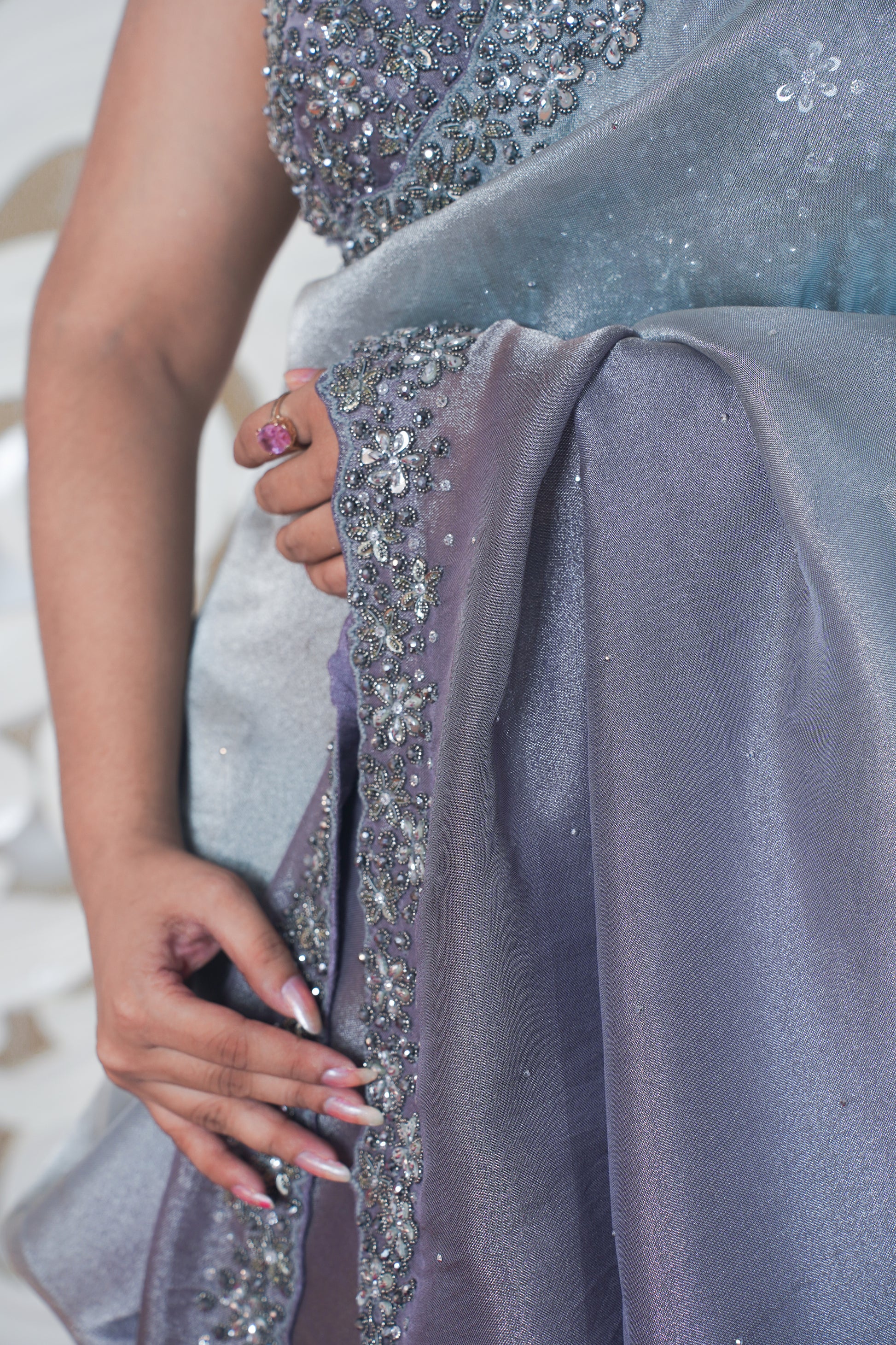 - Fabric: Crafted from lightweight, premium tissue silk, this saree offers a subtle, luxurious shimmer that catches the light beautifully as you move, giving you an effortlessly ethereal look.