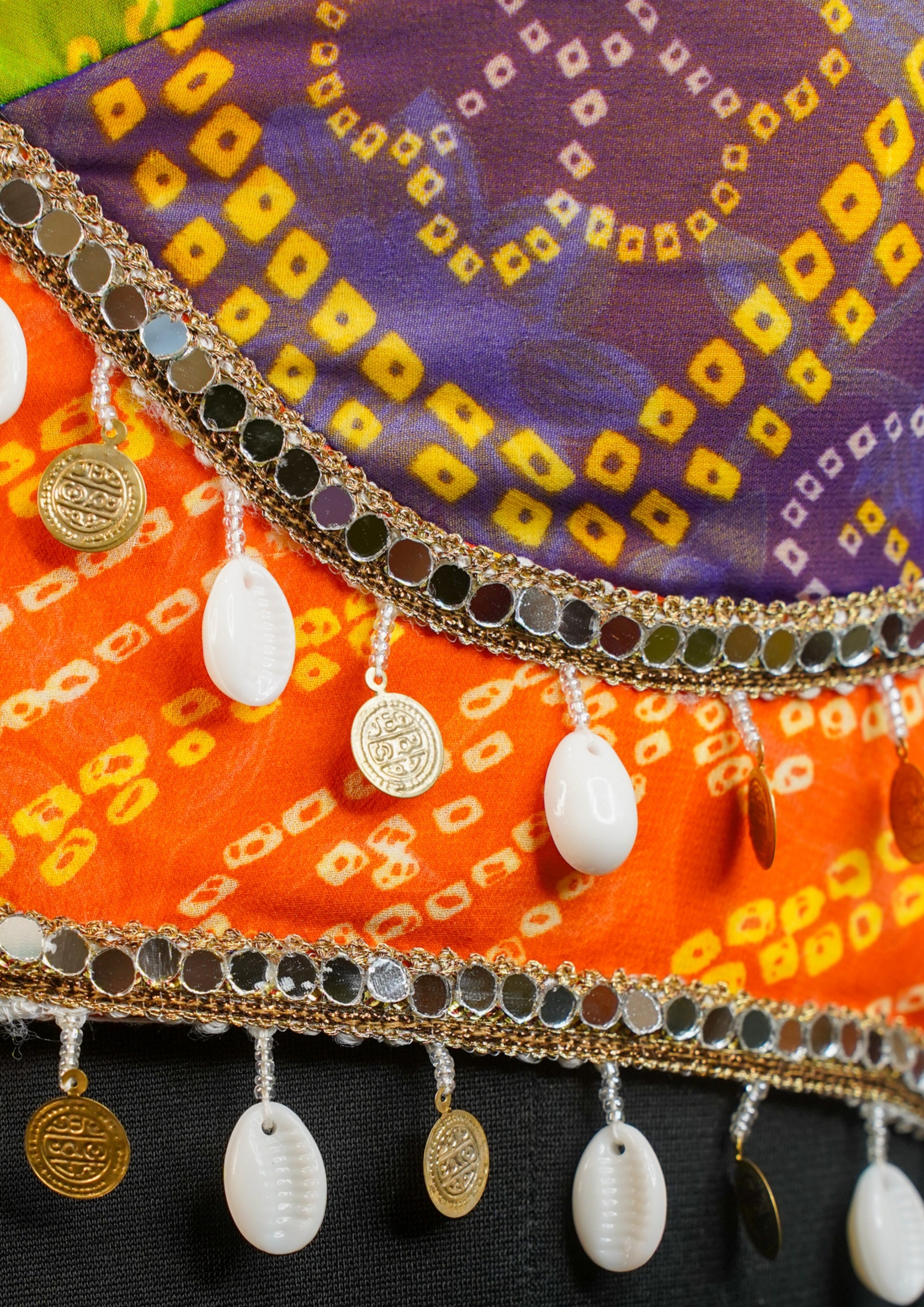 - Embellished with cowrie shells & golden coin tassels