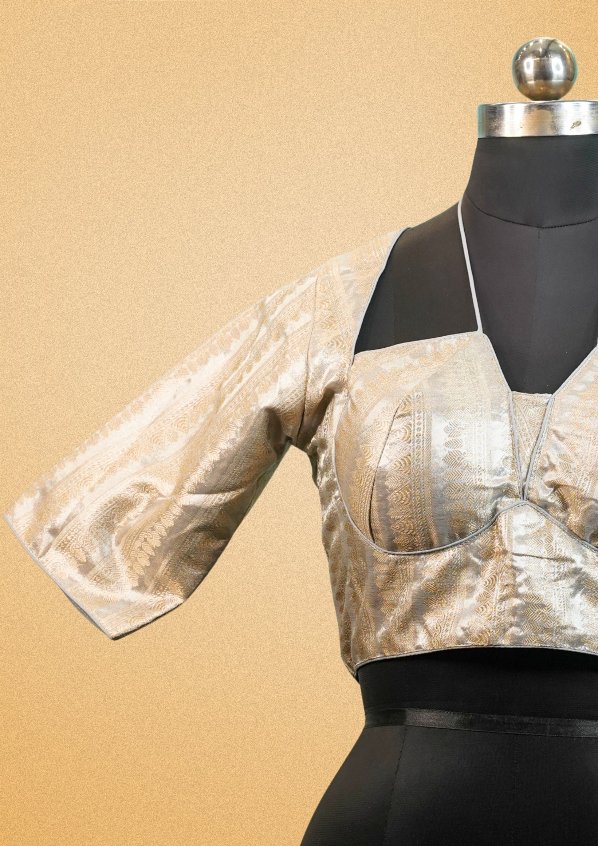 The front design features a deep sweetheart neckline with padded cups, ensuring both elegance and comfort. The half sleeves highlight intricate Banarasi weaving, offering a regal touch.