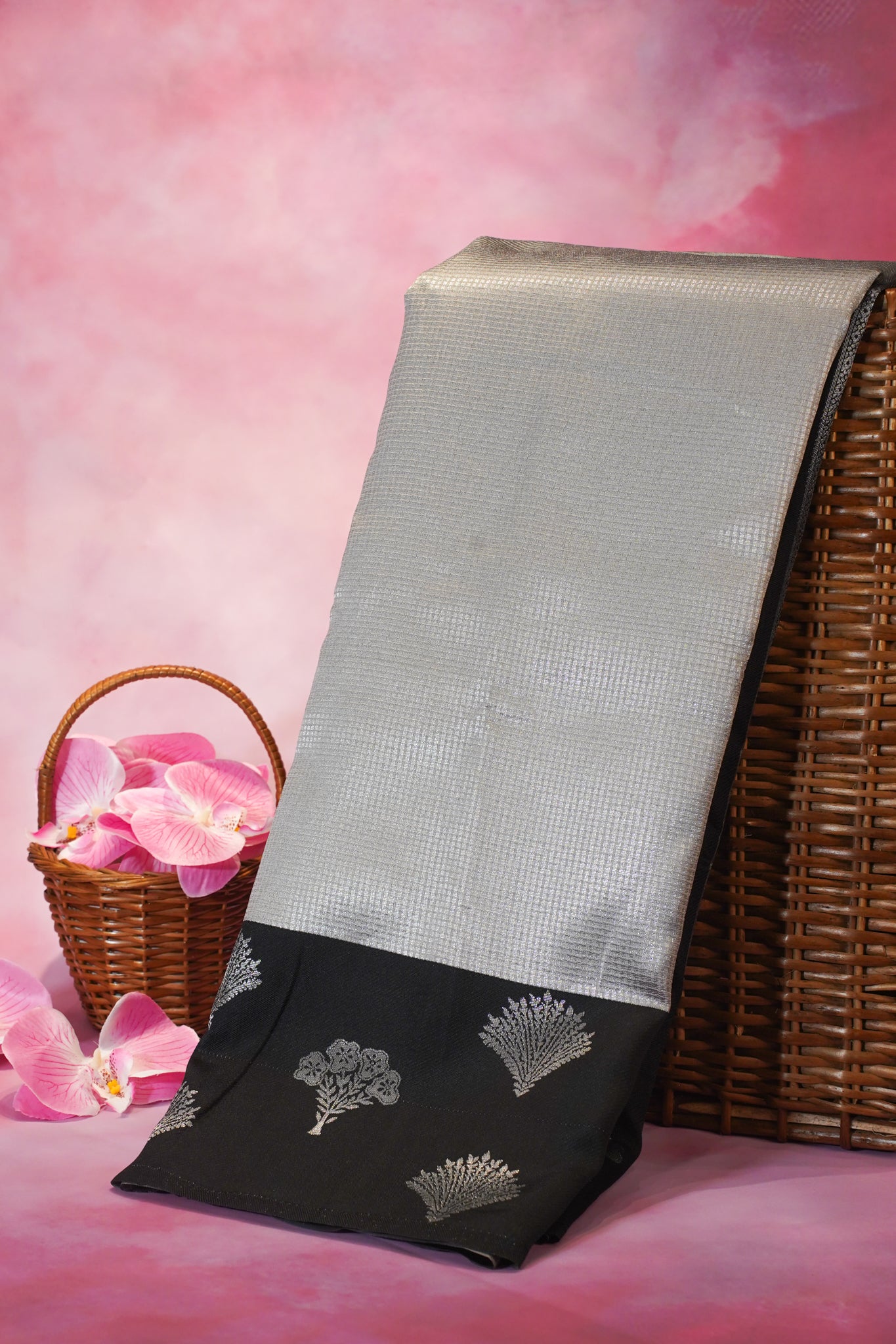 "Utsav Banaras 040B" Banarasi Tanchoi Silk Saree in Silver & Black with Elegant Zari Motifs