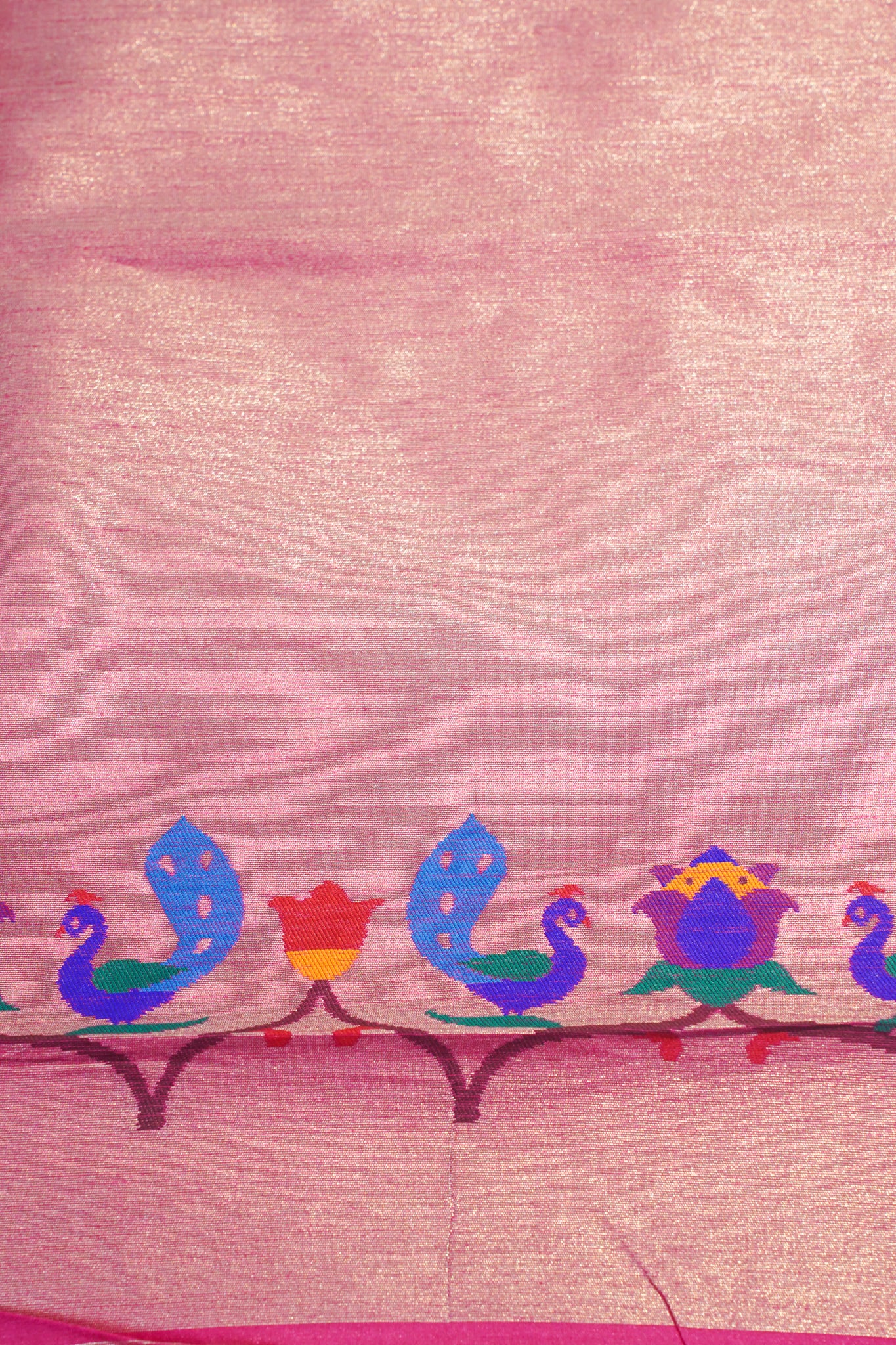 Elevate your ethnic wardrobe with this exquisite Banarasi Peacock Paithani Silk Saree, a masterpiece of timeless craftsmanship and elegance. Handwoven with premium silk, this saree features a luxurious pink base highlighted with shimmering zari work and traditional Paithani peacock motifs that symbolize grace and prosperity.