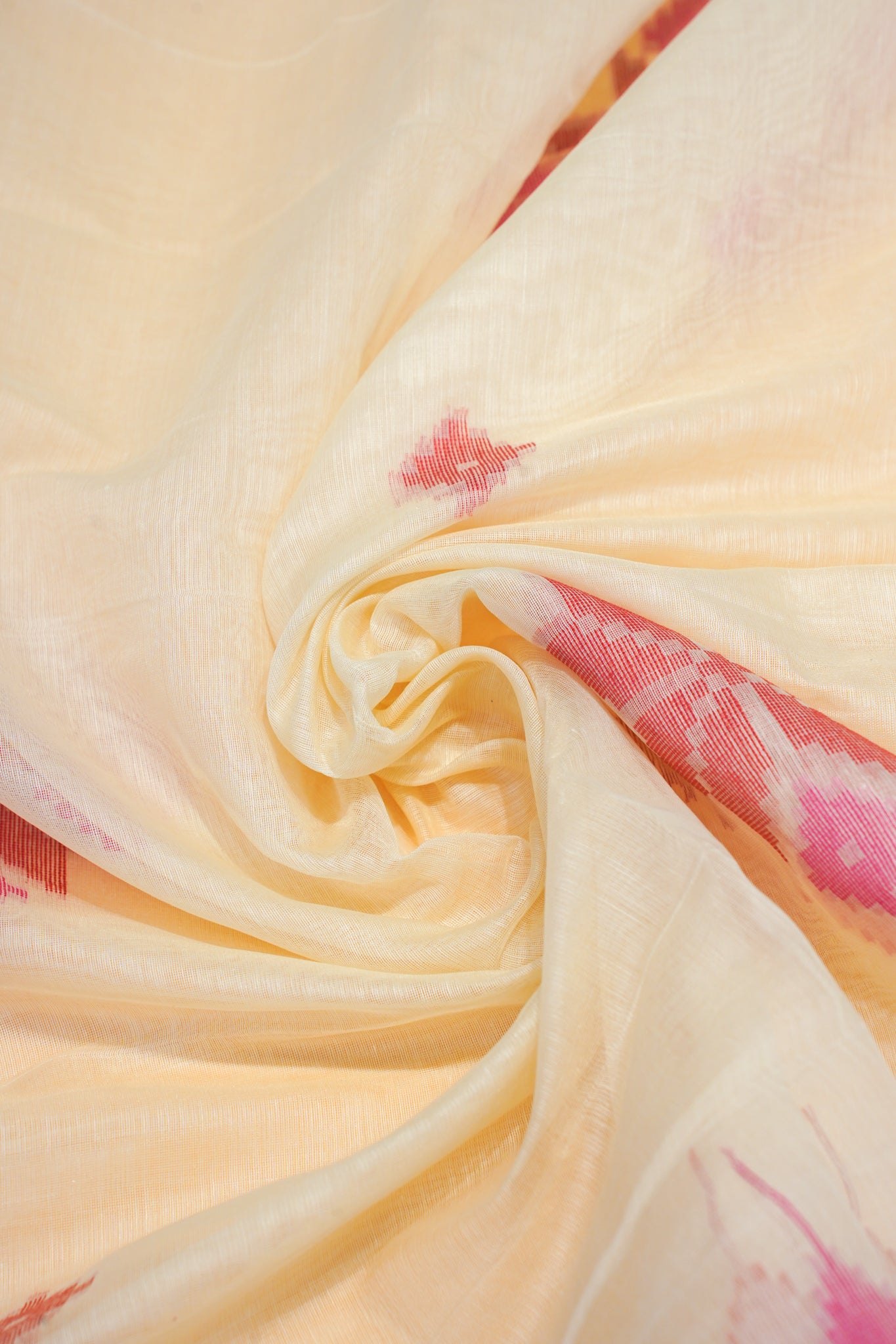 Add timeless grace to your wardrobe with this White Ikat Cotton Saree, designed for women who love minimal yet elegant ethnic fashion. Featuring a serene off-white base with pink ikat floral and diamond motifs, this saree beautifully combines simplicity with traditional craftsmanship.