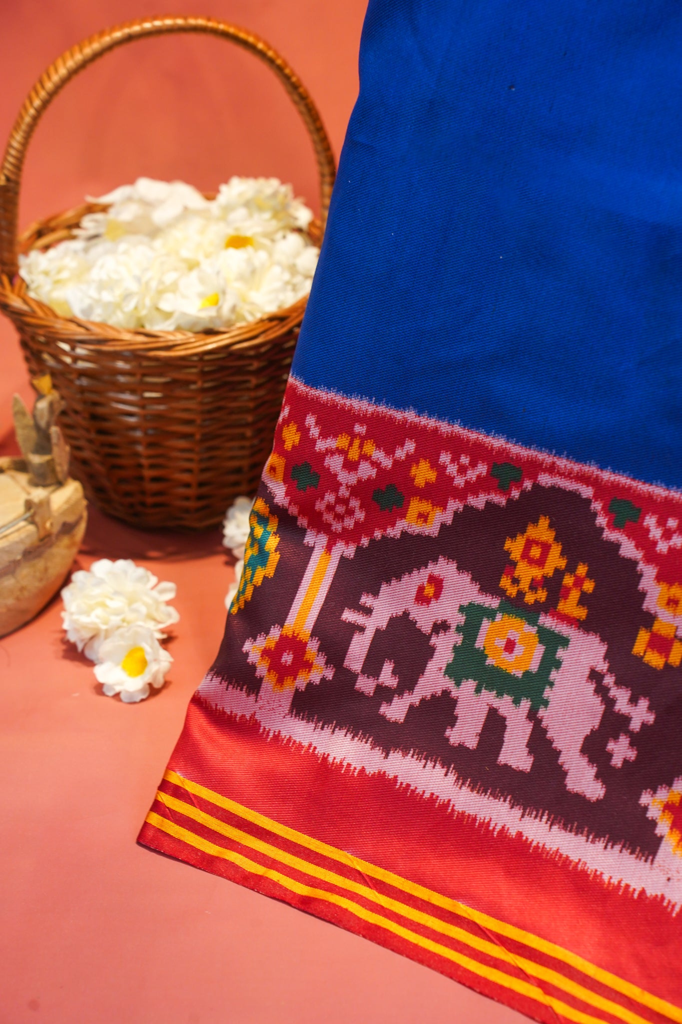 Discover the charm of timeless Banarasi craftsmanship with our Royal Blue Banarasi Patola Silk Saree, an exquisite drape that combines luxury, tradition, and elegance. Handwoven by skilled artisans, this saree showcases intricate elephant and peacock motifs in the border, inspired by royal heritage and temple art. The striking contrast of the vibrant red patola border with floral accents against the deep blue body creates a look of majestic grace.