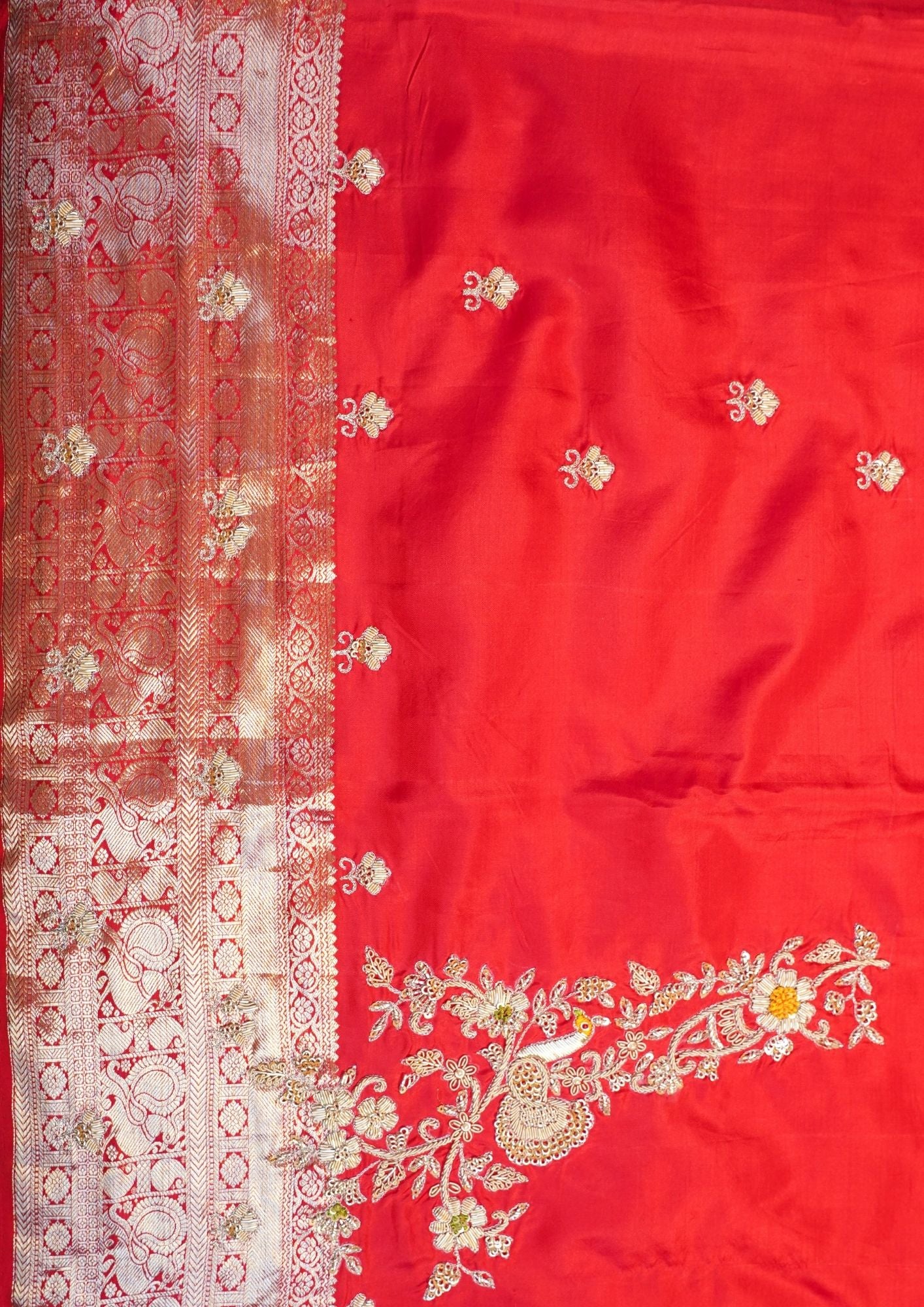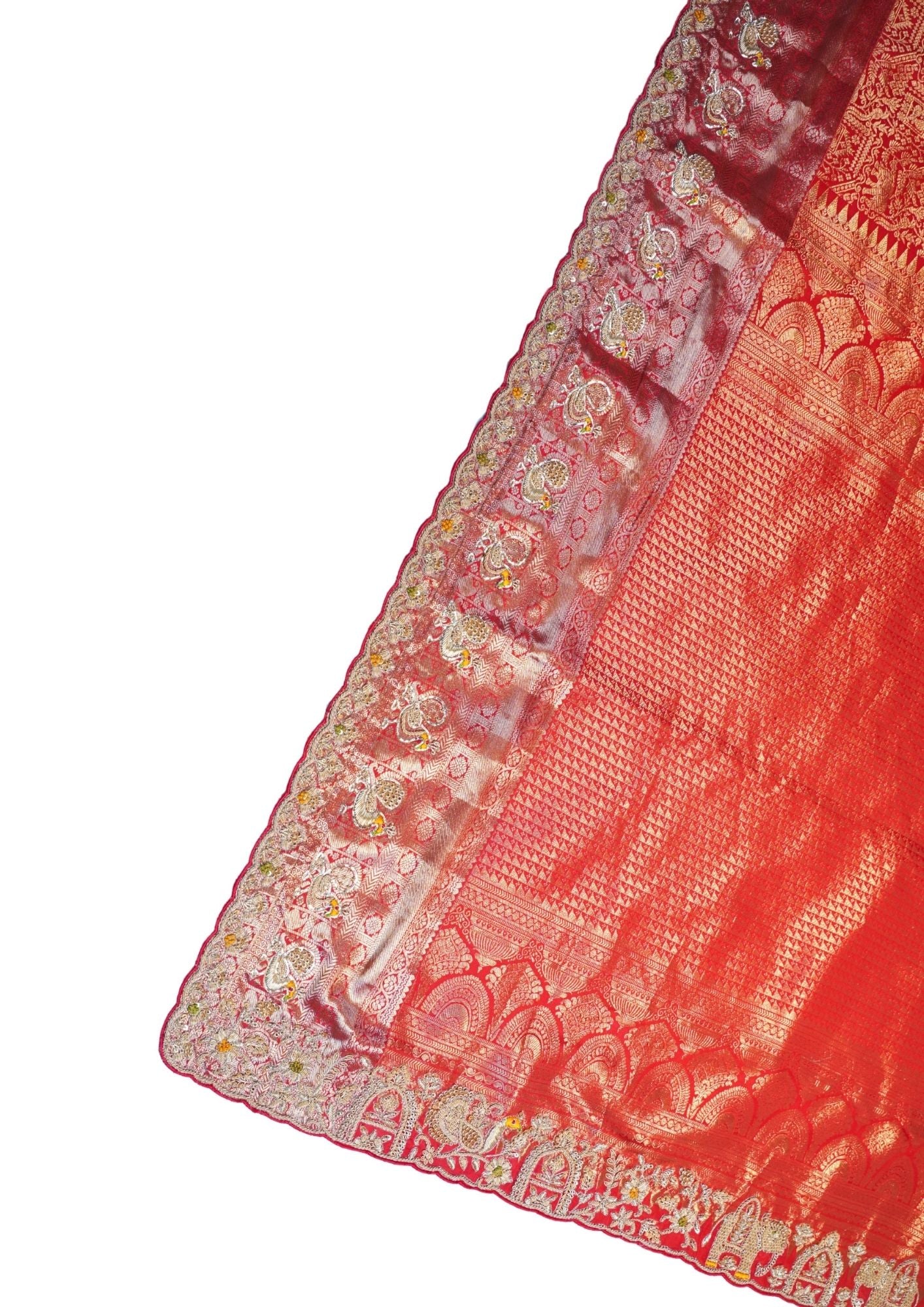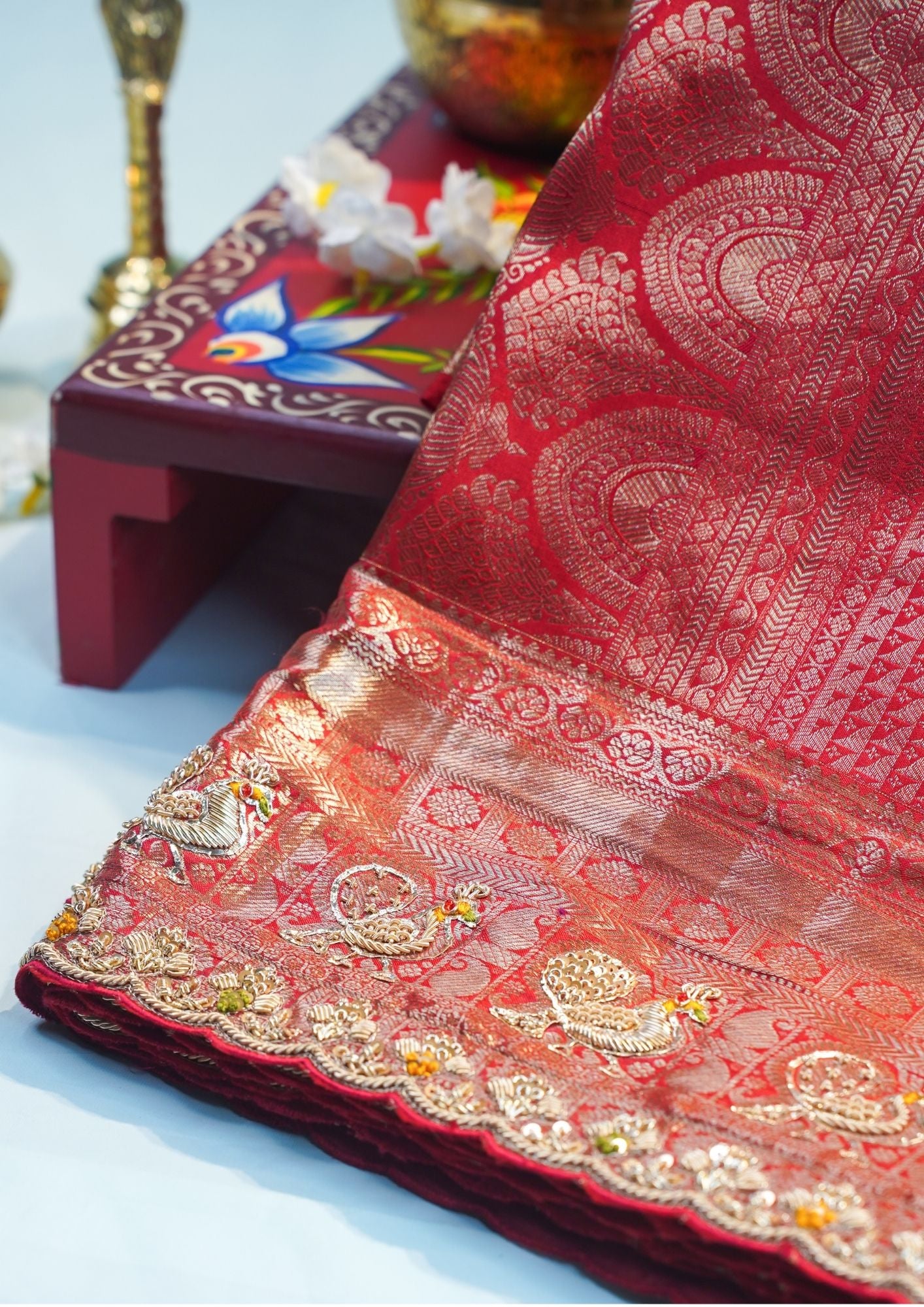 "VIRASAT 210" Banarasi Royal Red Pure Kanjivaram Barik Zardozi Cut Work Border Embroidered Silk Saree