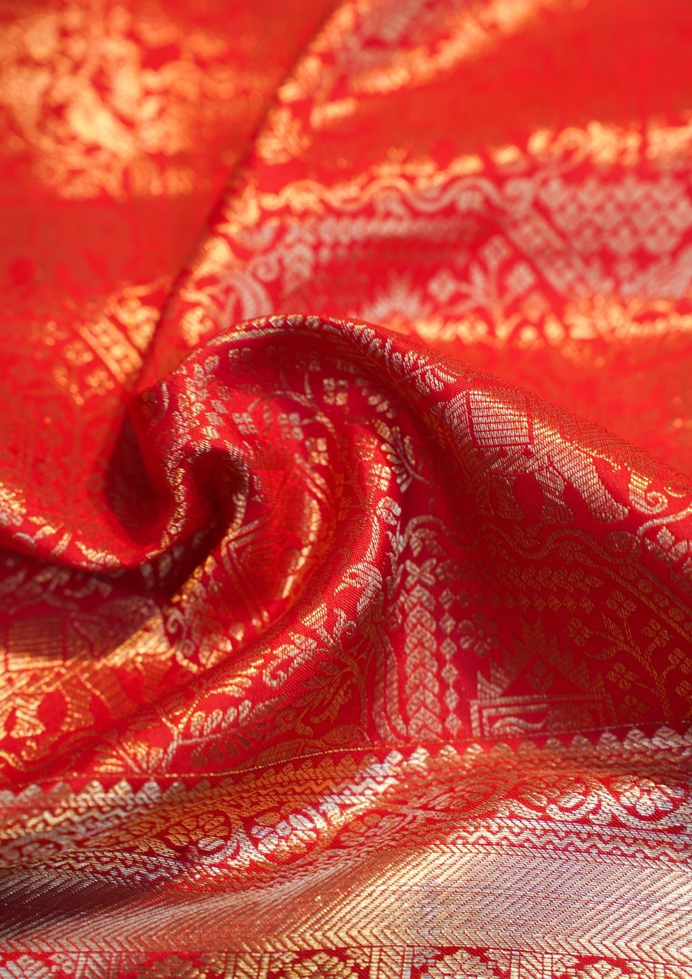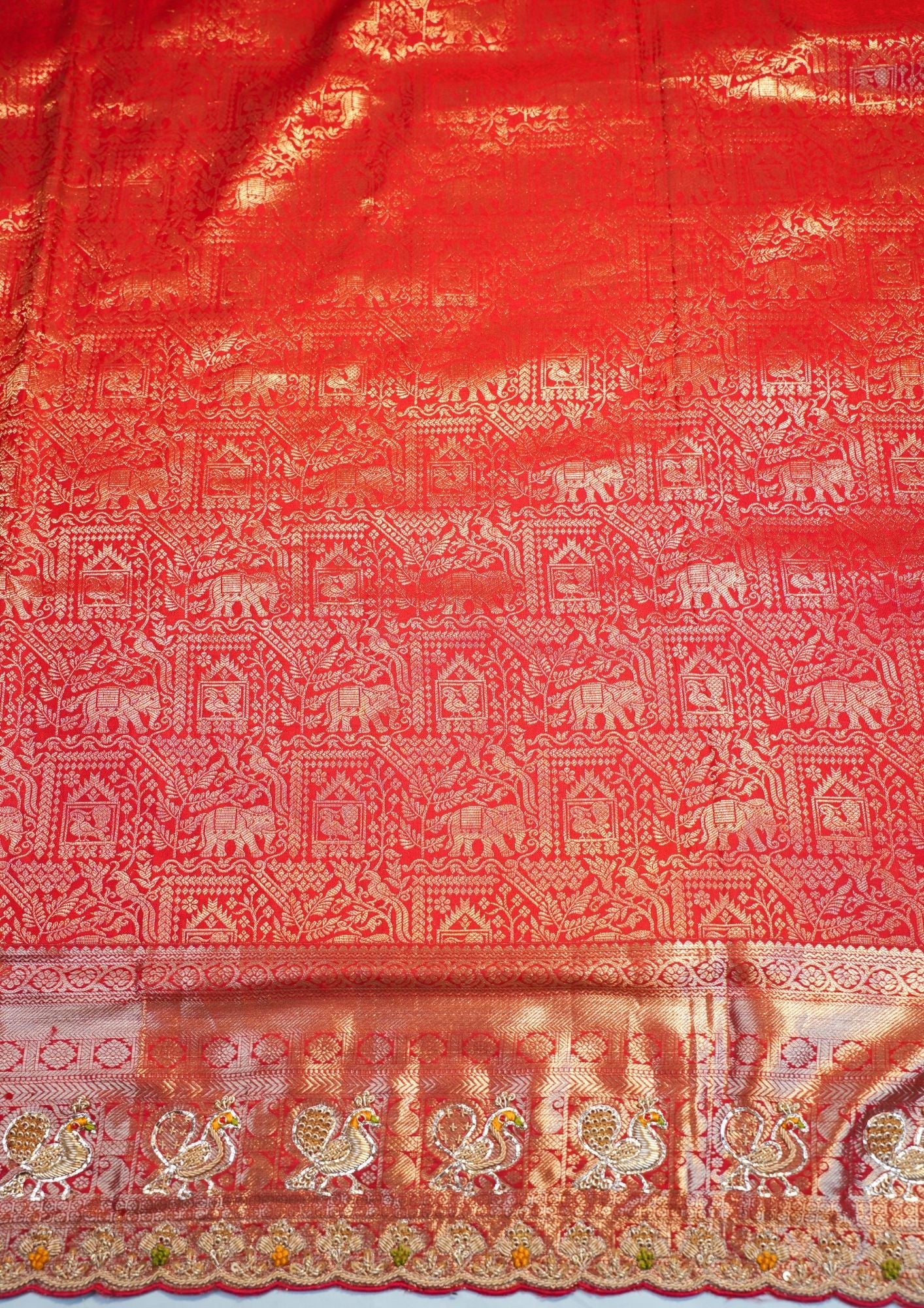 Woven in rich red silk with lustrous gold zari motifs of elephants, floral vines, and temple elements, the saree embodies the grandeur of Kanjivaram artistry. The barik zardozi peacock embroidery on the border adds a touch of regal finesse, with sequins, zari, and resham work enhancing its opulence. Perfect for weddings, bridal wear, festivals, and auspicious occasions.