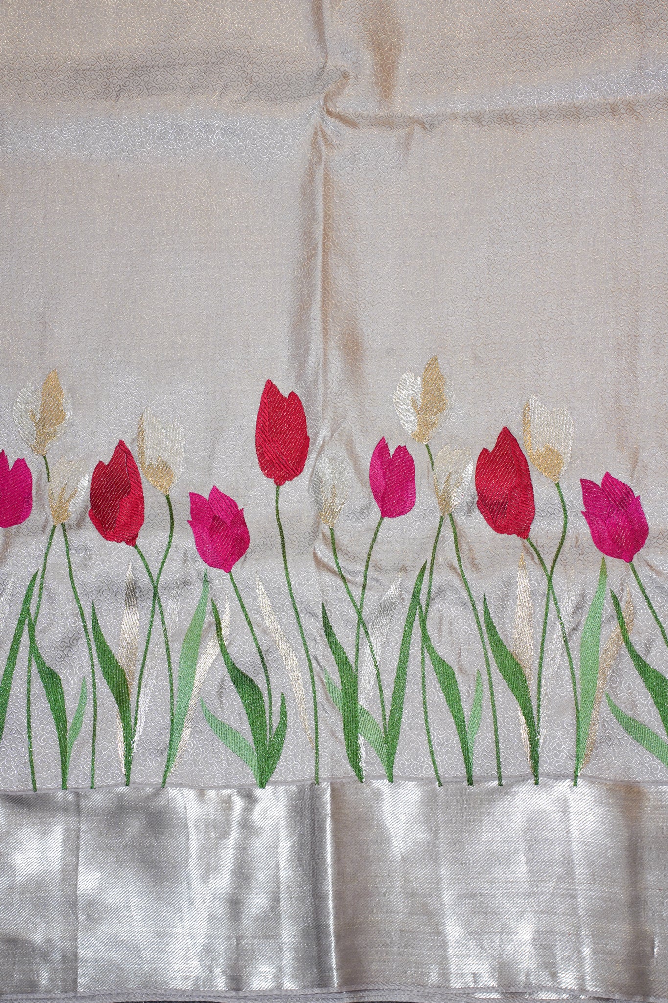 - Border & Pallu: Minimalist Silver Finish for a Regal Look