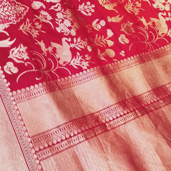 Step into a world of timeless grandeur with this Crimson Red Banarasi Malbari Silk Saree, a garment that captures the very essence of Indian celebration. This is not merely a piece of clothing; it is a canvas where the master weavers of Banaras have painted a scene of nature using threads of pure silver. Designed for the bride who seeks tradition with a touch of distinctive elegance, or the connoisseur who appreciates the finer nuances of silk, this saree is a celebration of femininity and grace.