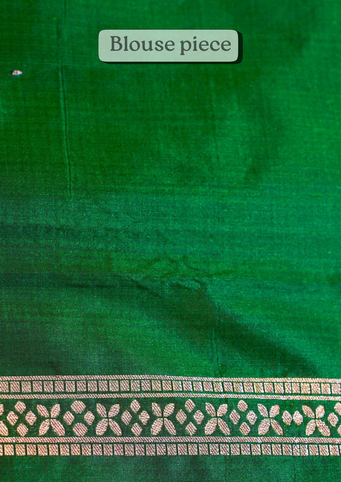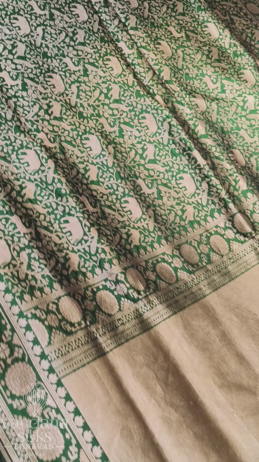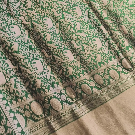 Wear a piece of history with this majestic Emerald Green Banarasi Pure Brocade Saree, featuring the legendary Shikargah (Royal Hunt) weave. Historically reserved for royalty, the Shikargah design is one of the most complex and celebrated traditions of Varanasi handloom.