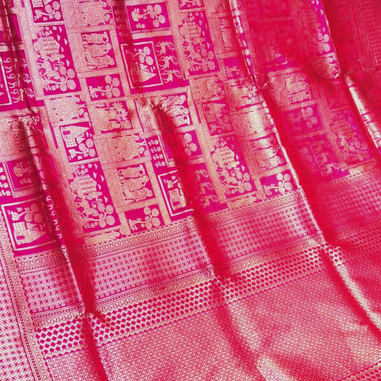 Embrace a unique blend of heritage and storytelling with this stunning Banarasi Uppada Silk Saree. Bathed in a vibrant Rani Pink hue, this saree stands out for its distinctive Tribal (Warli-inspired) motifs woven intricately in shimmering Silver Zari. The body features detailed rectangular blocks depicting village scenes—including dancing figures, deer, trees, and huts—creating a "Shikargah" style narrative with a rustic charm. Crafted from lightweight Uppada silk, it offers the rich look of a traditional Banarasi brocade without the heaviness, making it a comfortable yet statement-making choice for cultural events and festive celebrations.