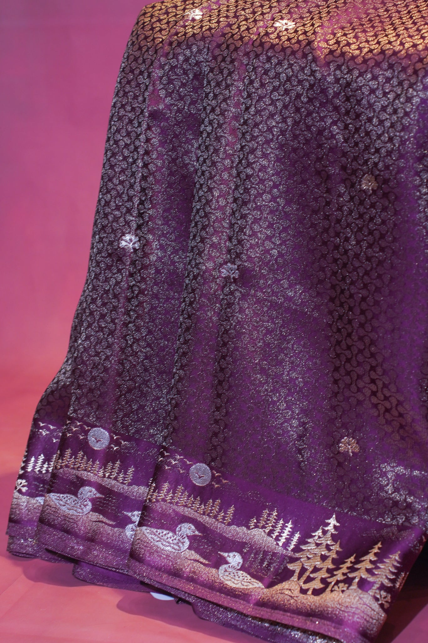 This saree is a visual poem draped in a rich Aubergine (Wine) hue. The true magic lies in its unique Scenic Brocade Pallu. Unlike traditional floral patterns, this weave depicts a serene landscape: tall Pine/Fir Trees, graceful Swans/Ducks gliding on water, and a Full Moon illuminating the night. The body of the saree features a textured, geometric brocade pattern that adds depth and richness to the fabric.