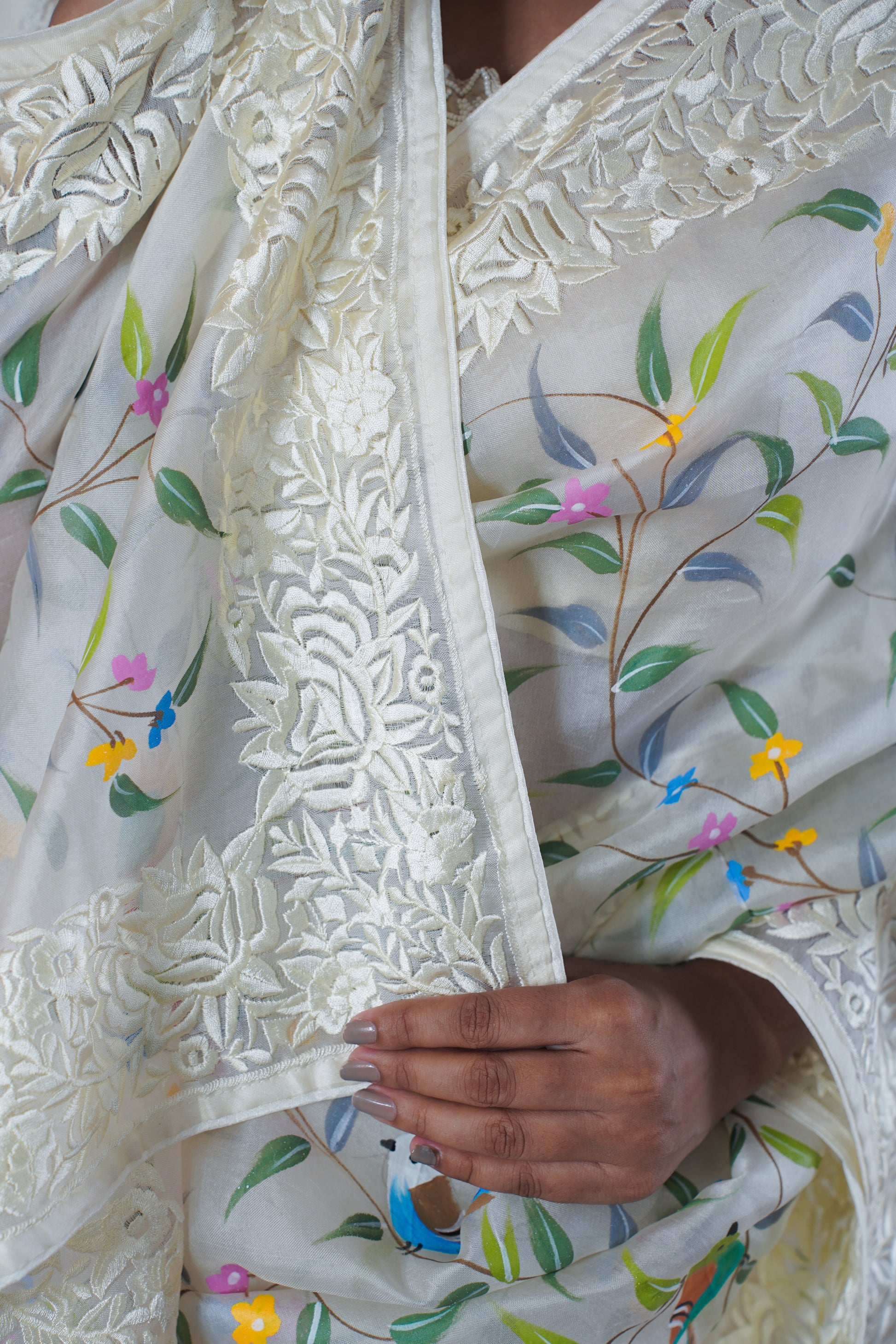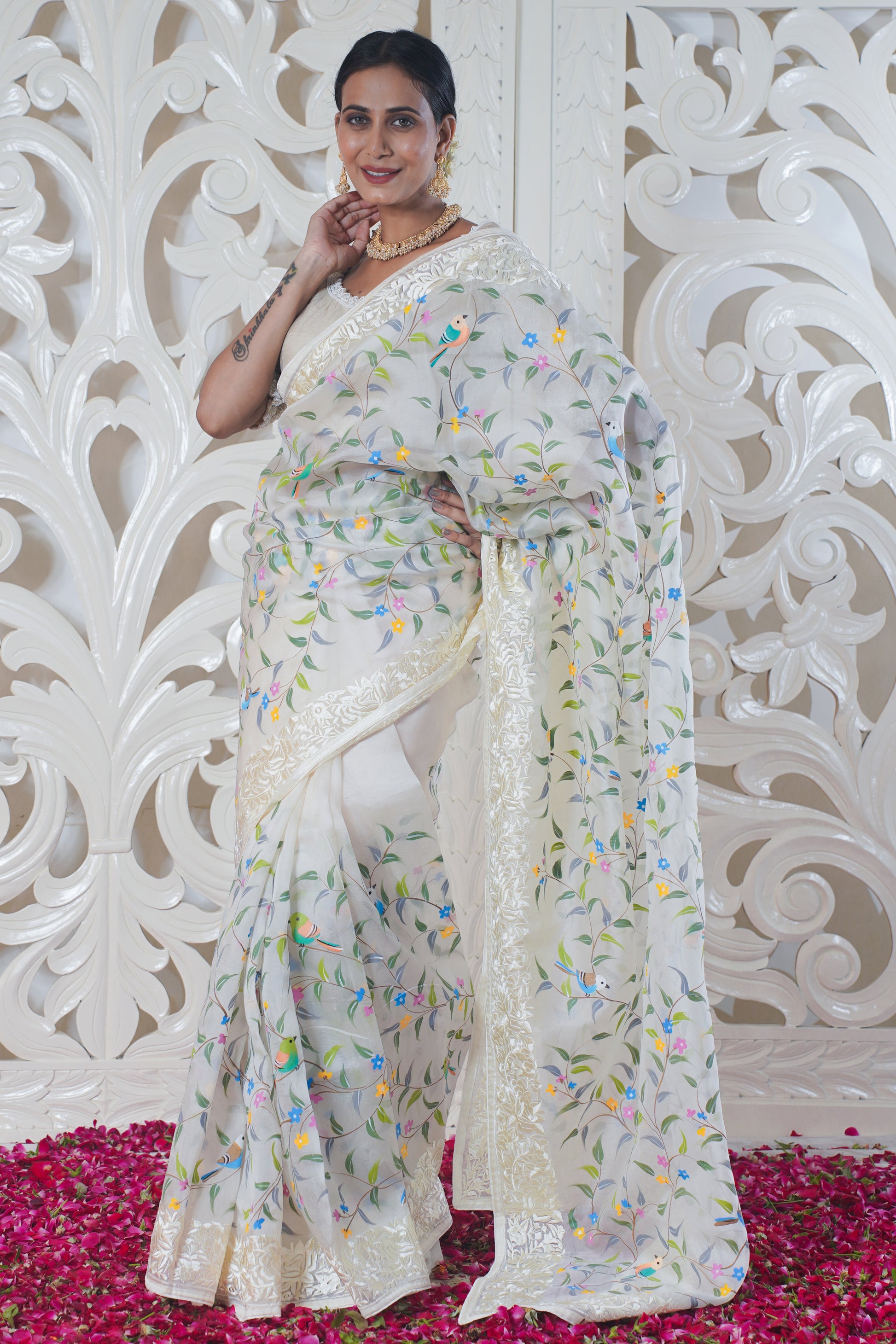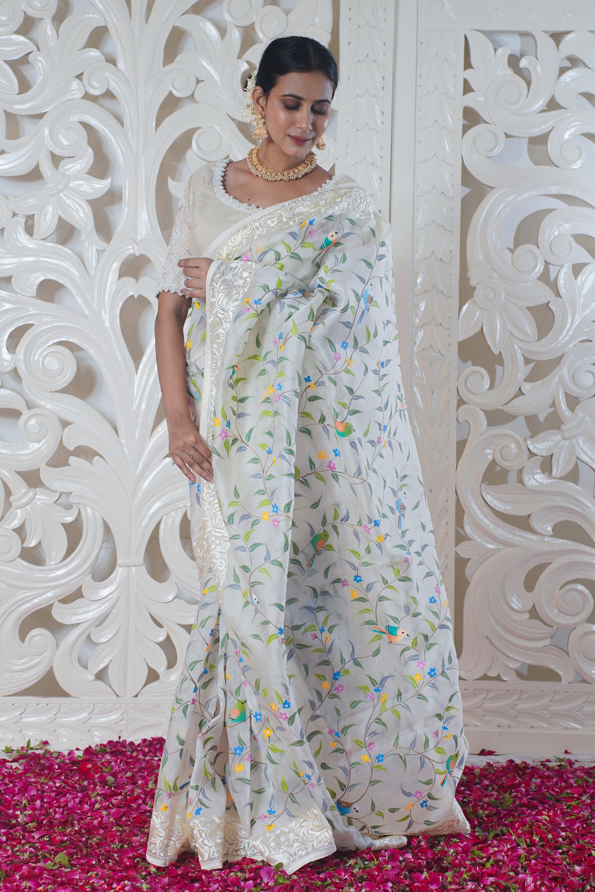 - Color: The pure white color exudes grace, purity, and sophistication, making it perfect for special moments when understated elegance is key. The detailed threadwork brings a unique charm, making this saree both modern and classic.