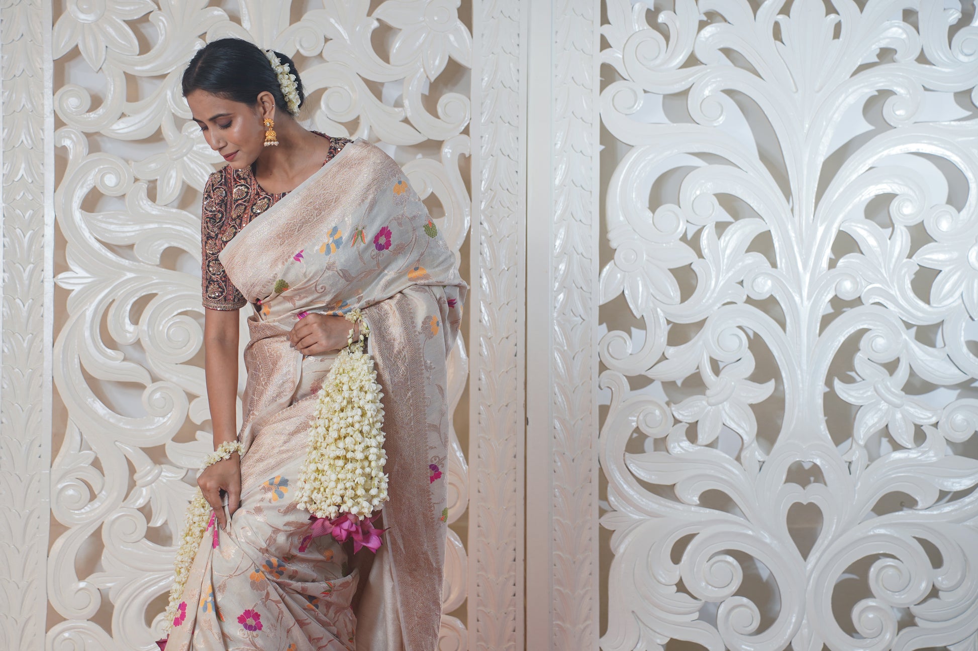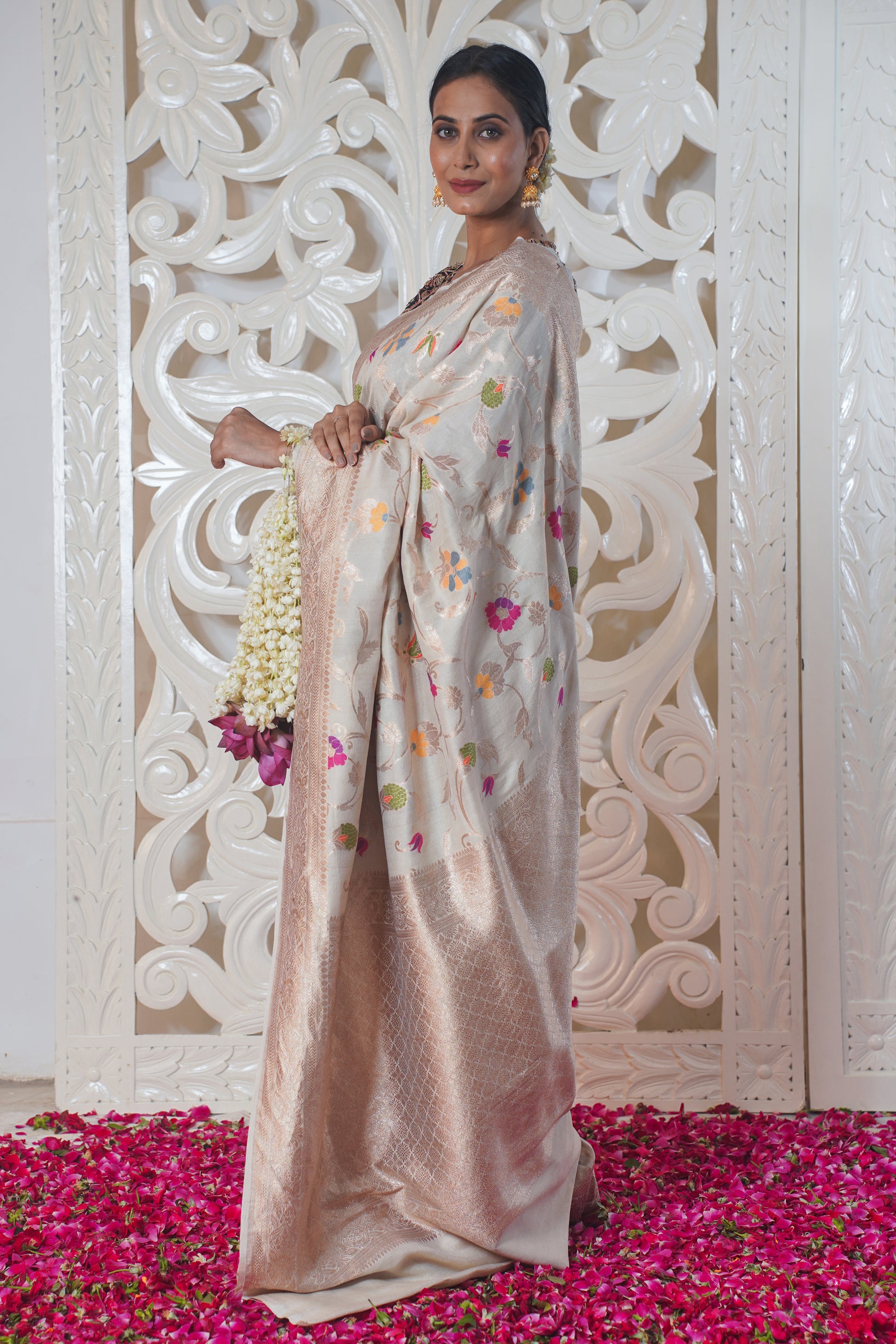 "Virasat 142" White Pure Silk Banarasi Saree With Meenakari work
